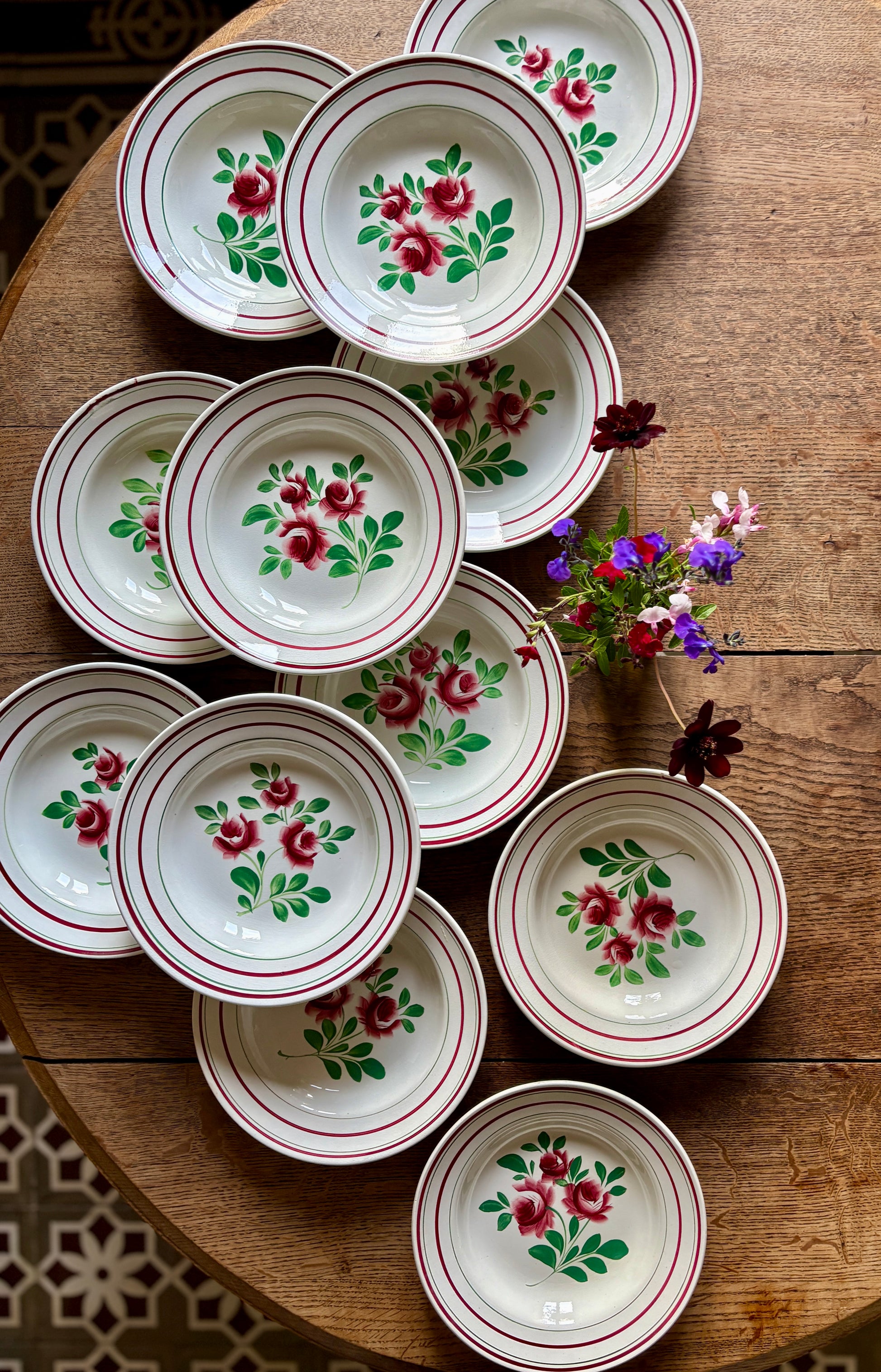 Très joli lot de 12 assiettes creuses vintage, modèle Les Roses