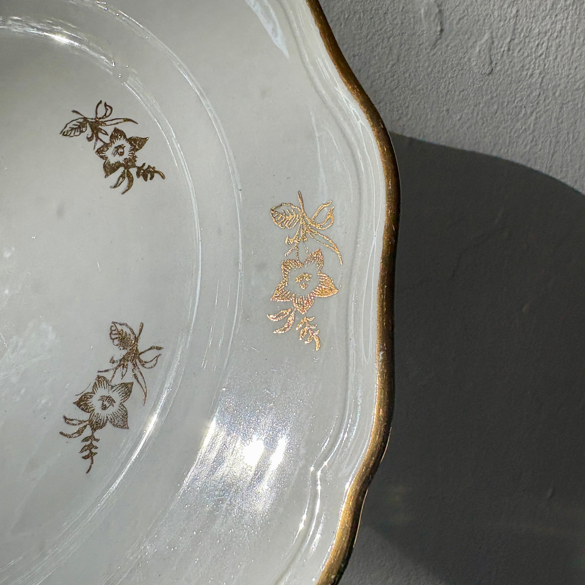 Lot de 12 assiettes plates vintage en demi porcelaine avec détails dorés - L'amandinoise