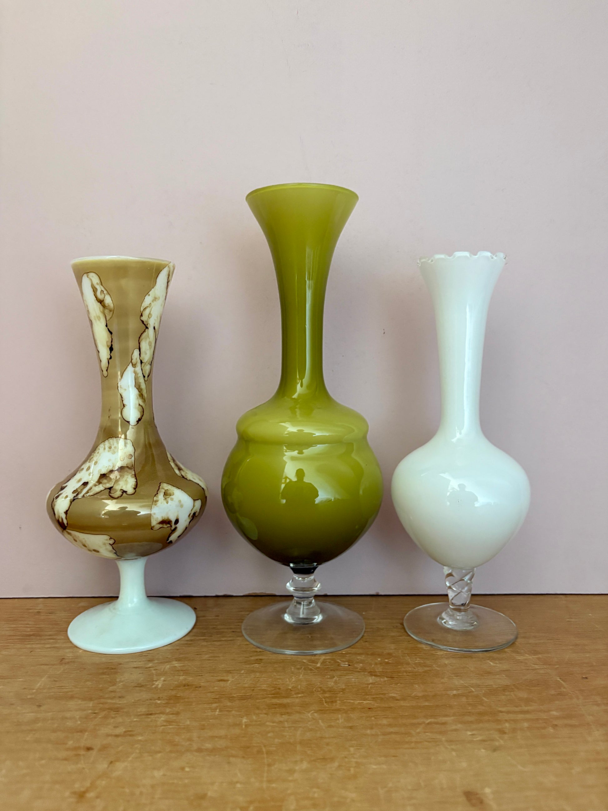 Très joli lot de soliflores vintage en verre et opaline blancs et kakis