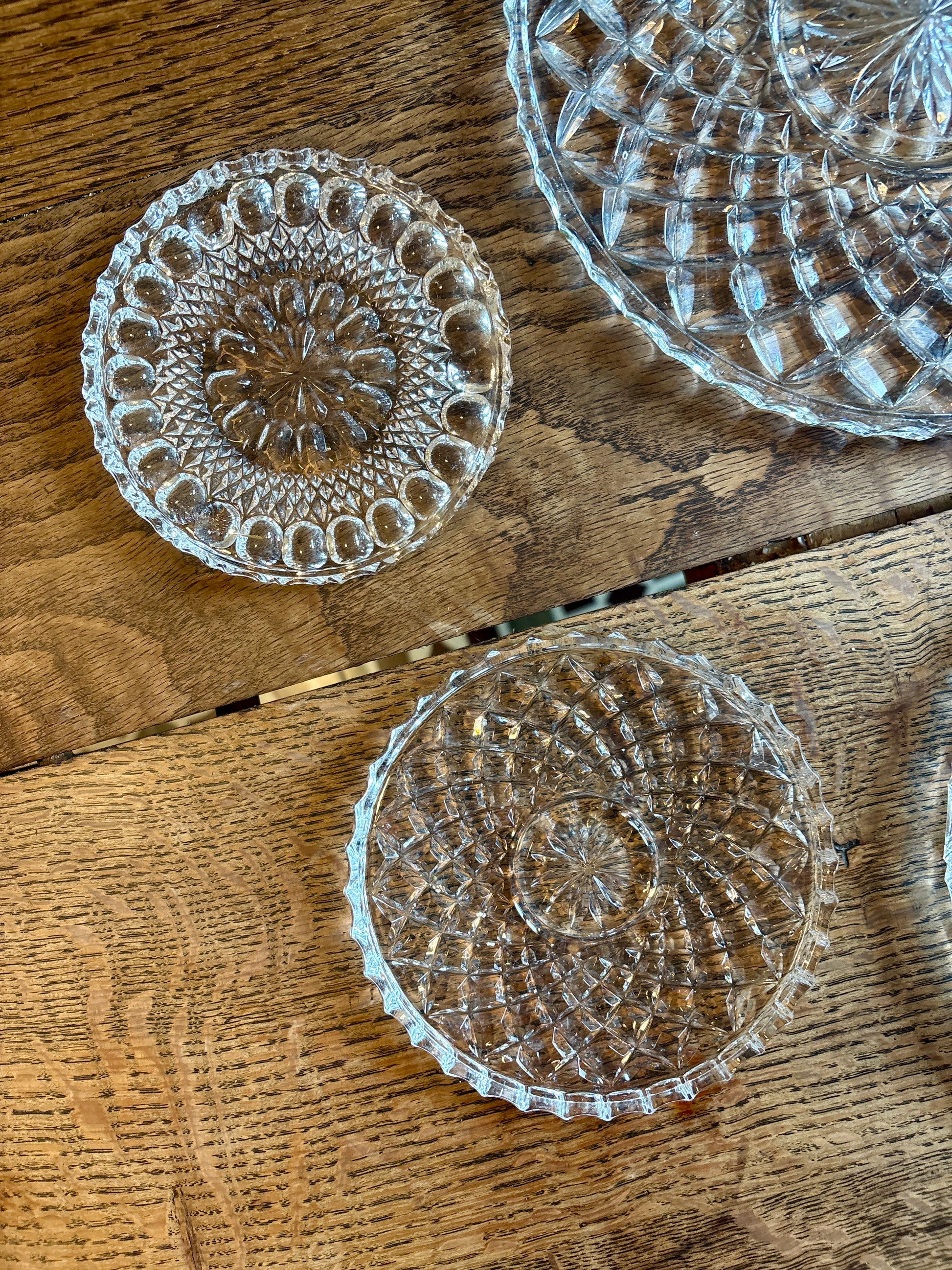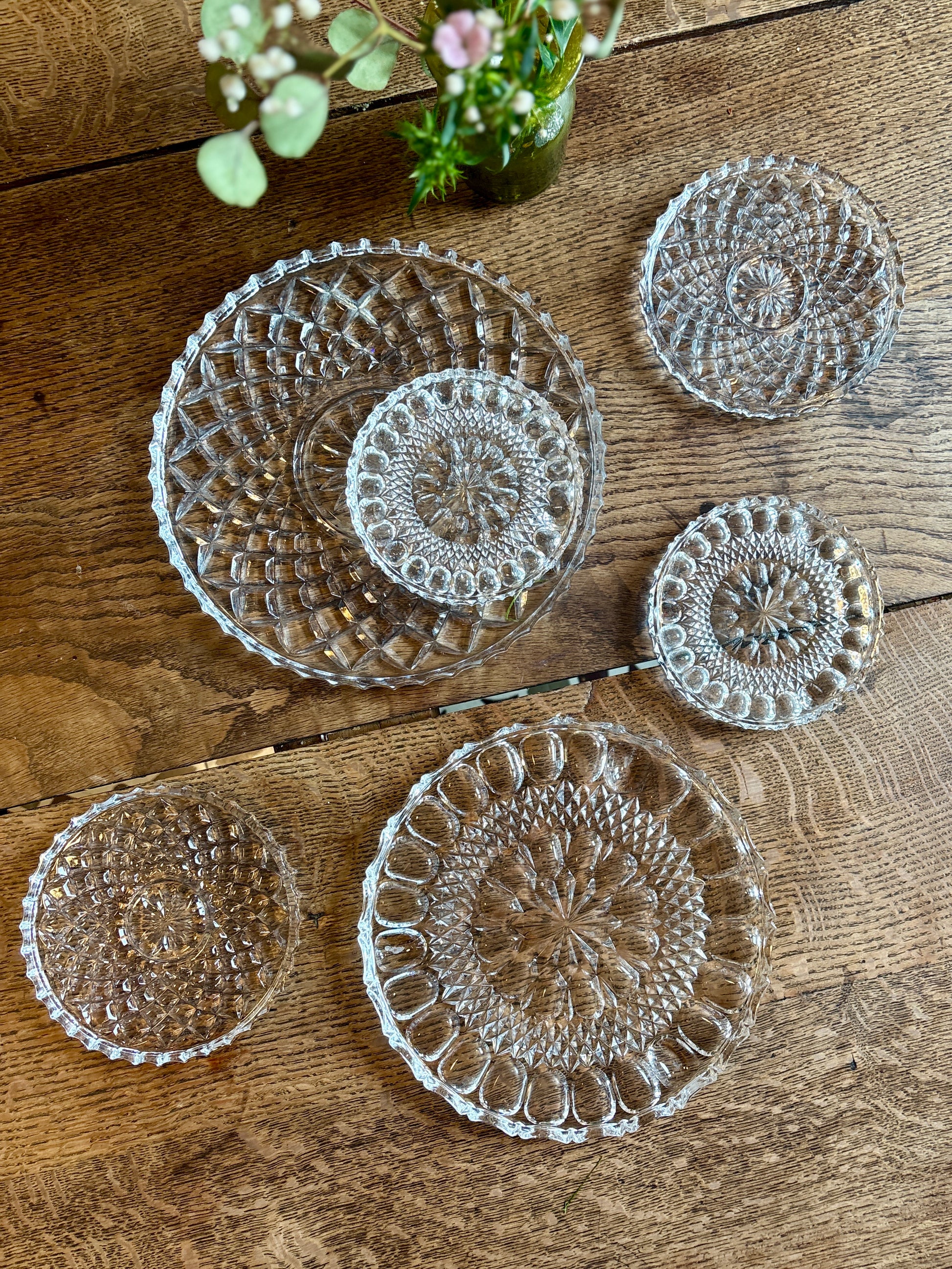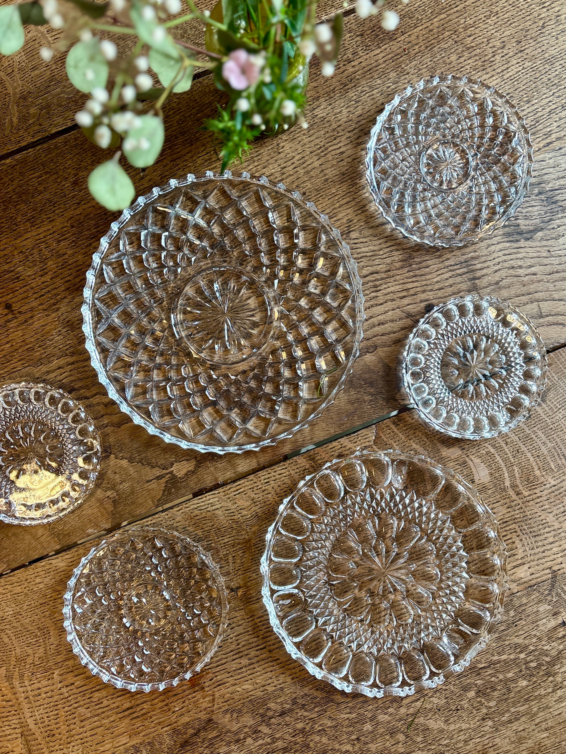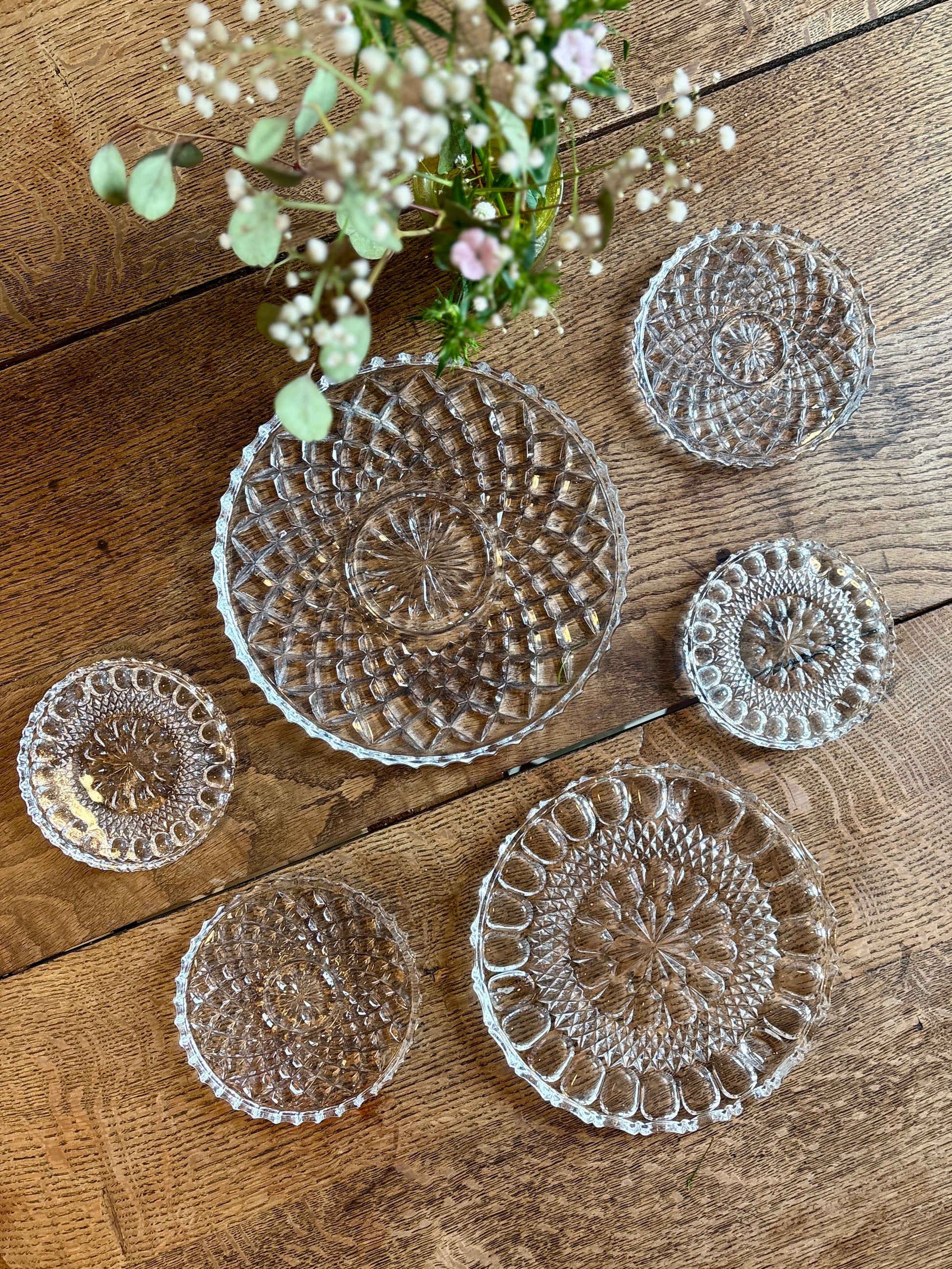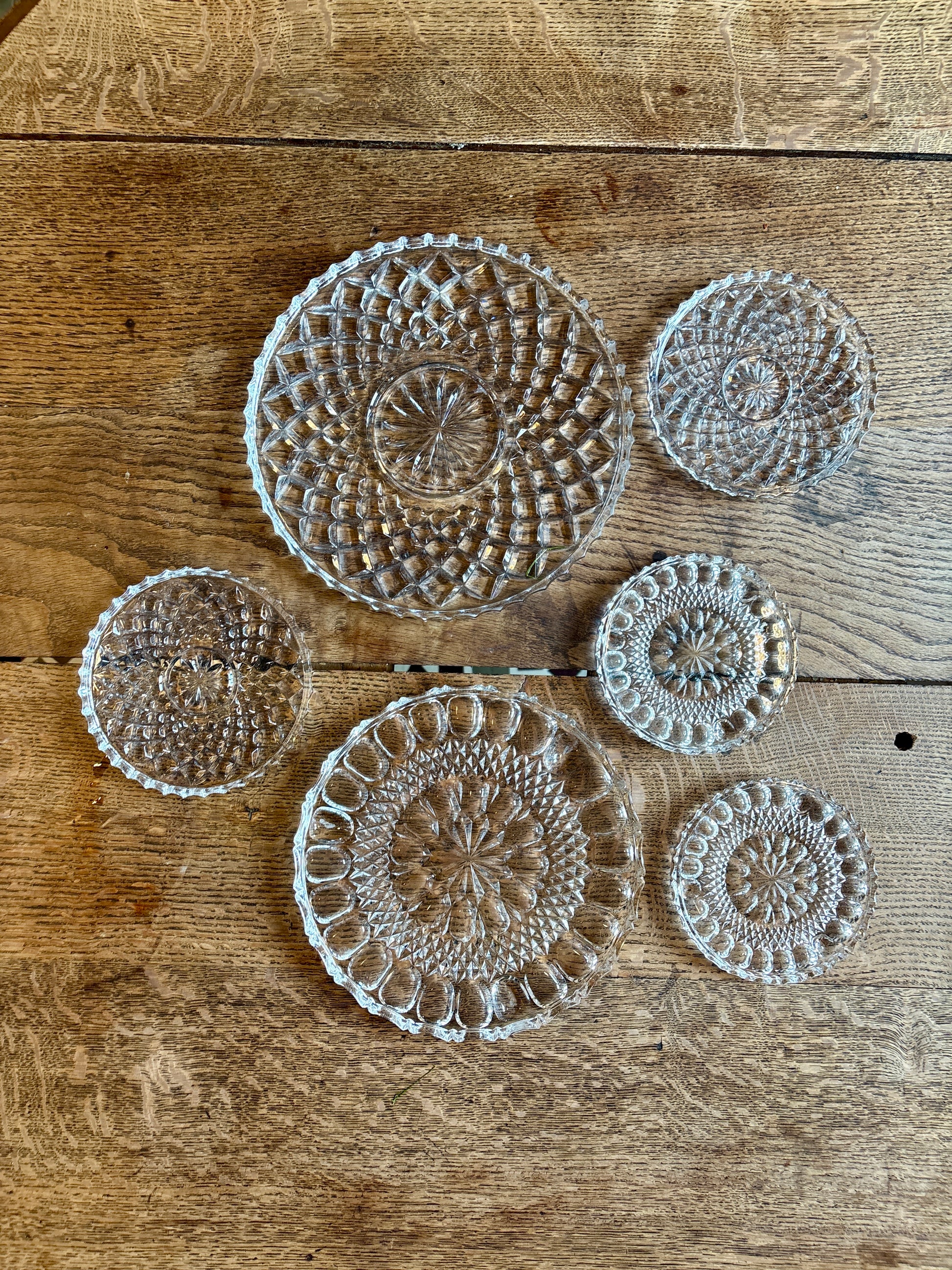 Très joli lot de 6 dessous de plat, dessous de bouteille en verre travaillé. Ils peuvent être utilisés en plat de présentation, plateau à bougie, dépose bijoux...
