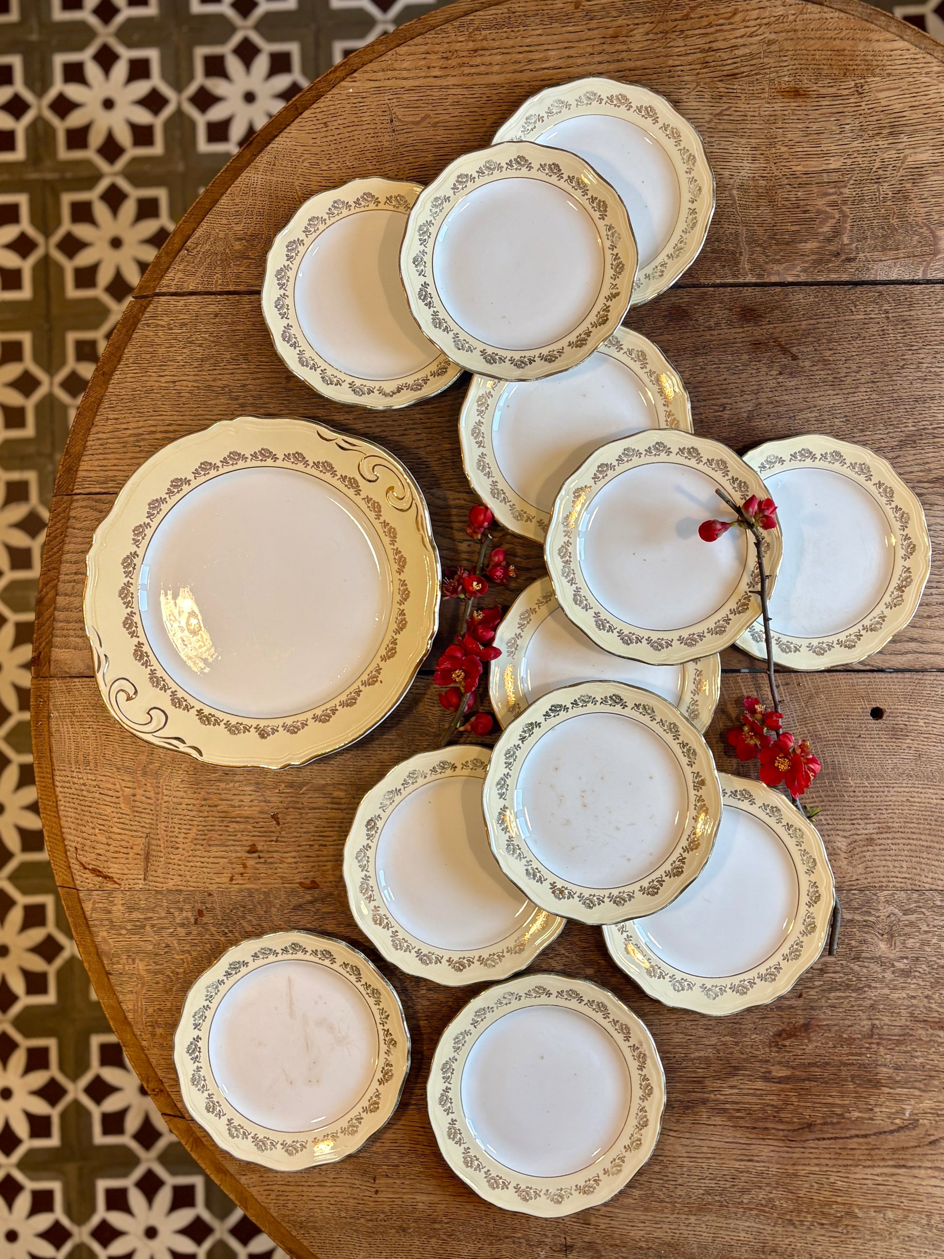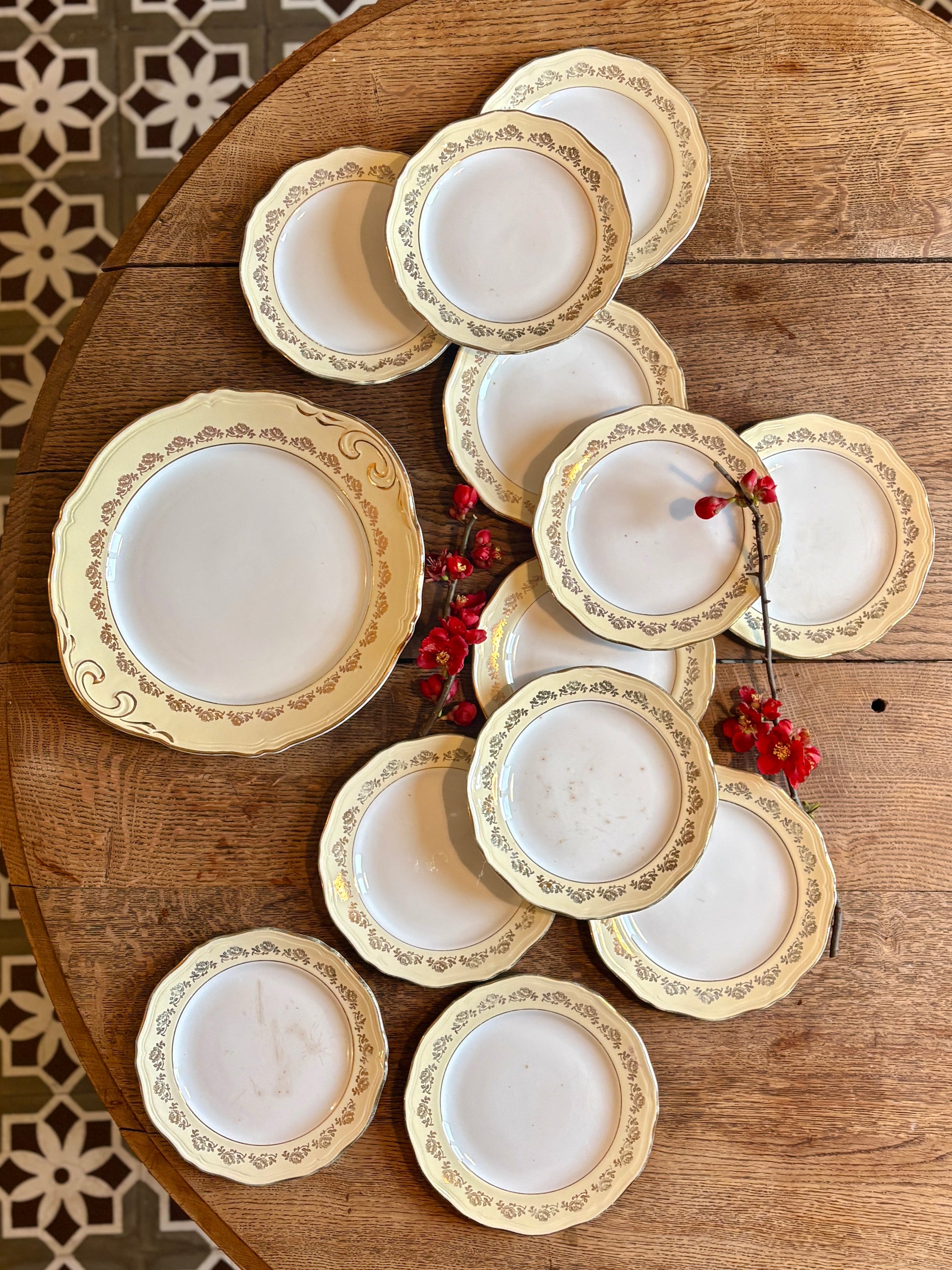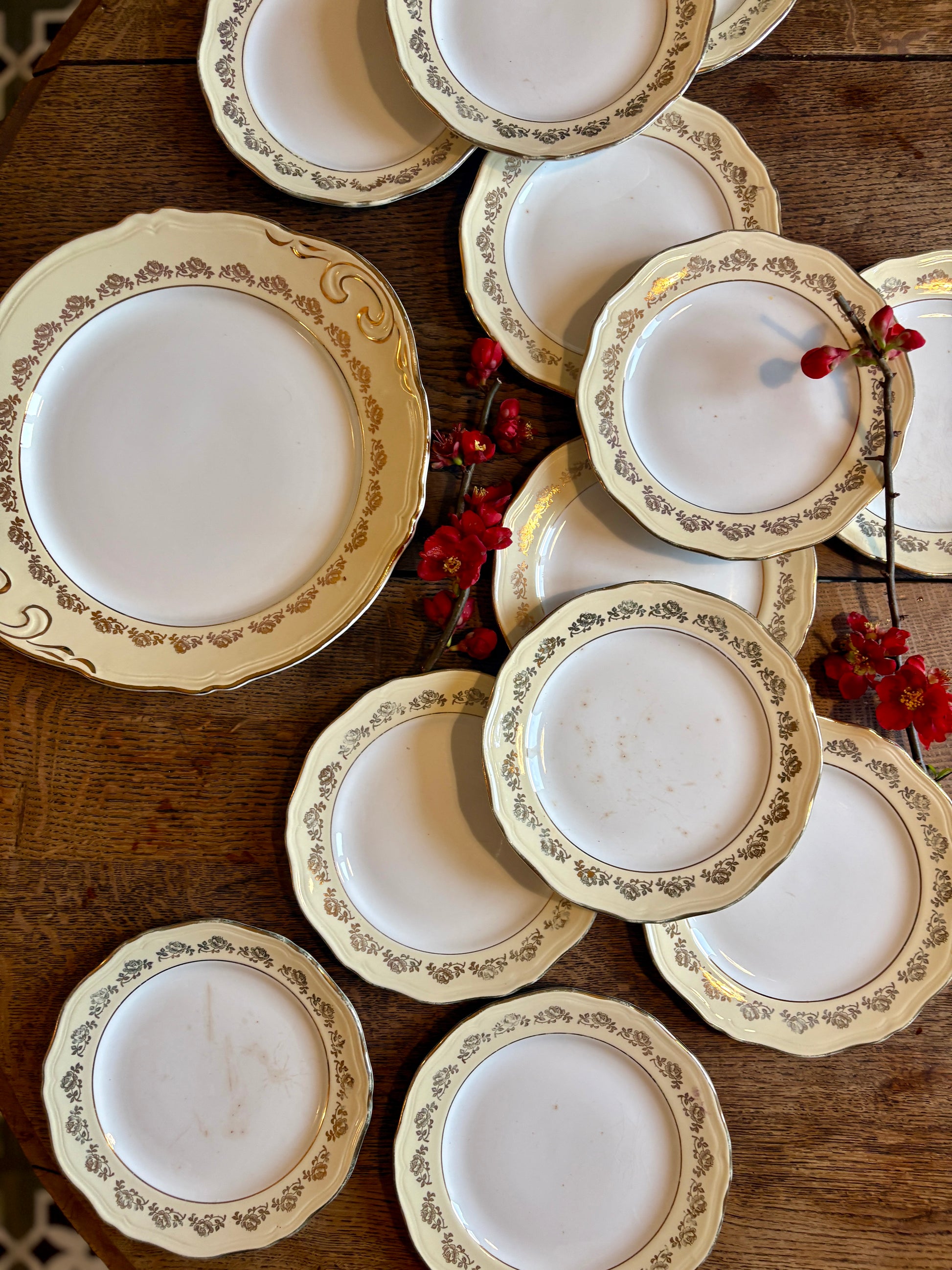 Le tout est en très bon état, juste à noter quelques léger manque au niveau des dorures et deux assiettes patinées par le temps. - Voir photos -
