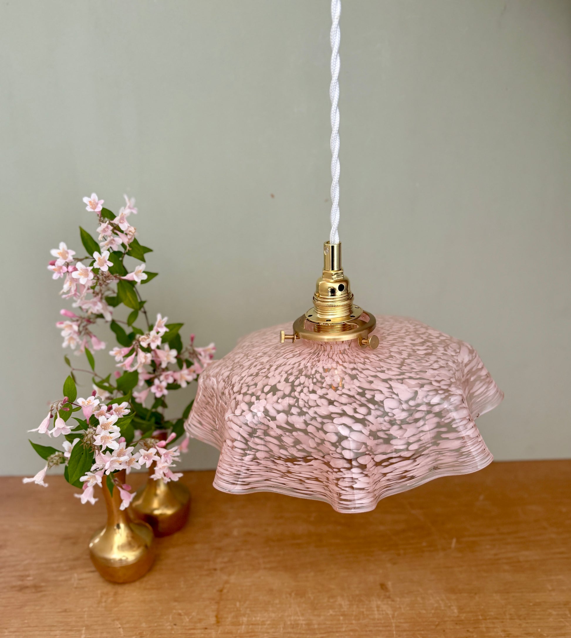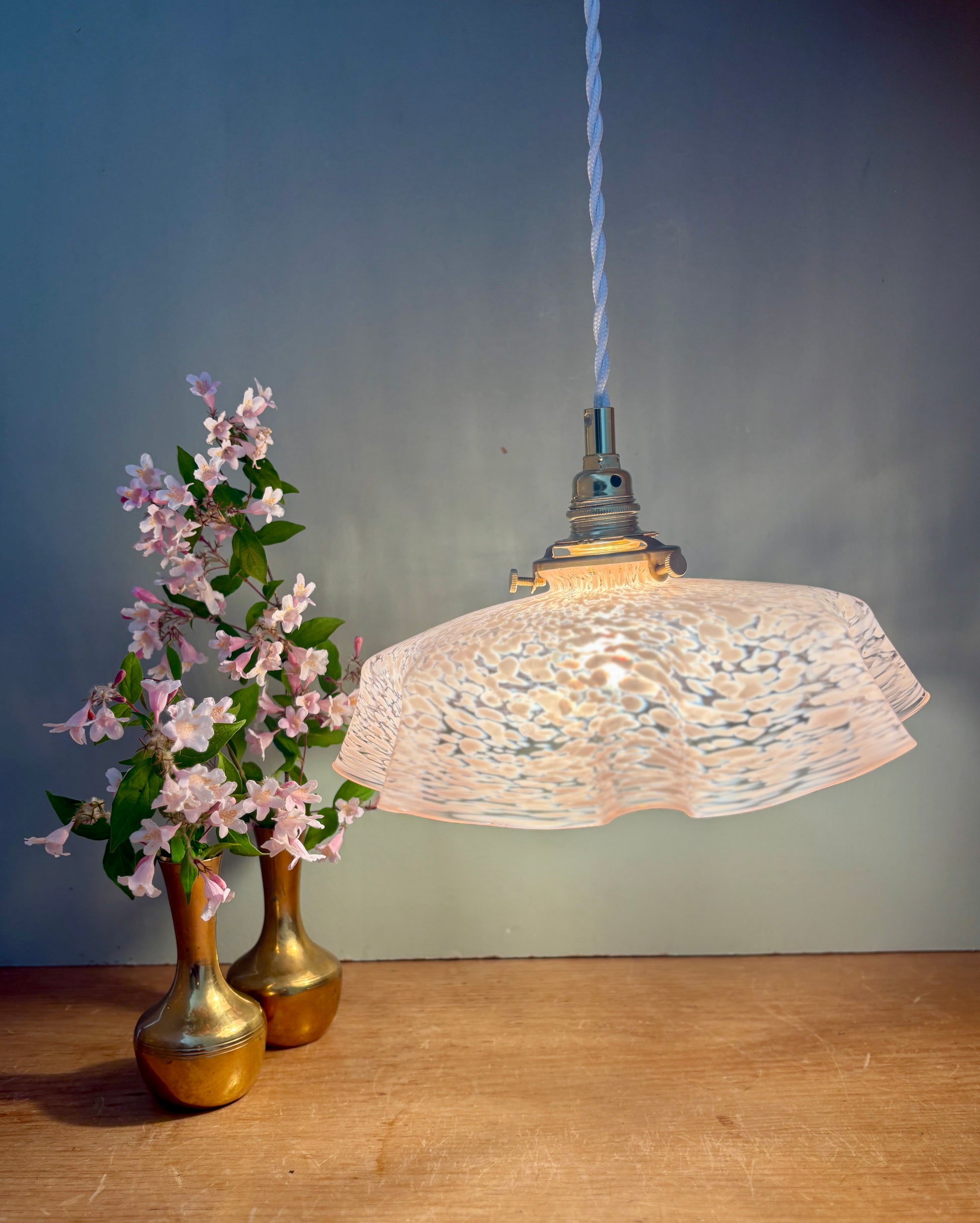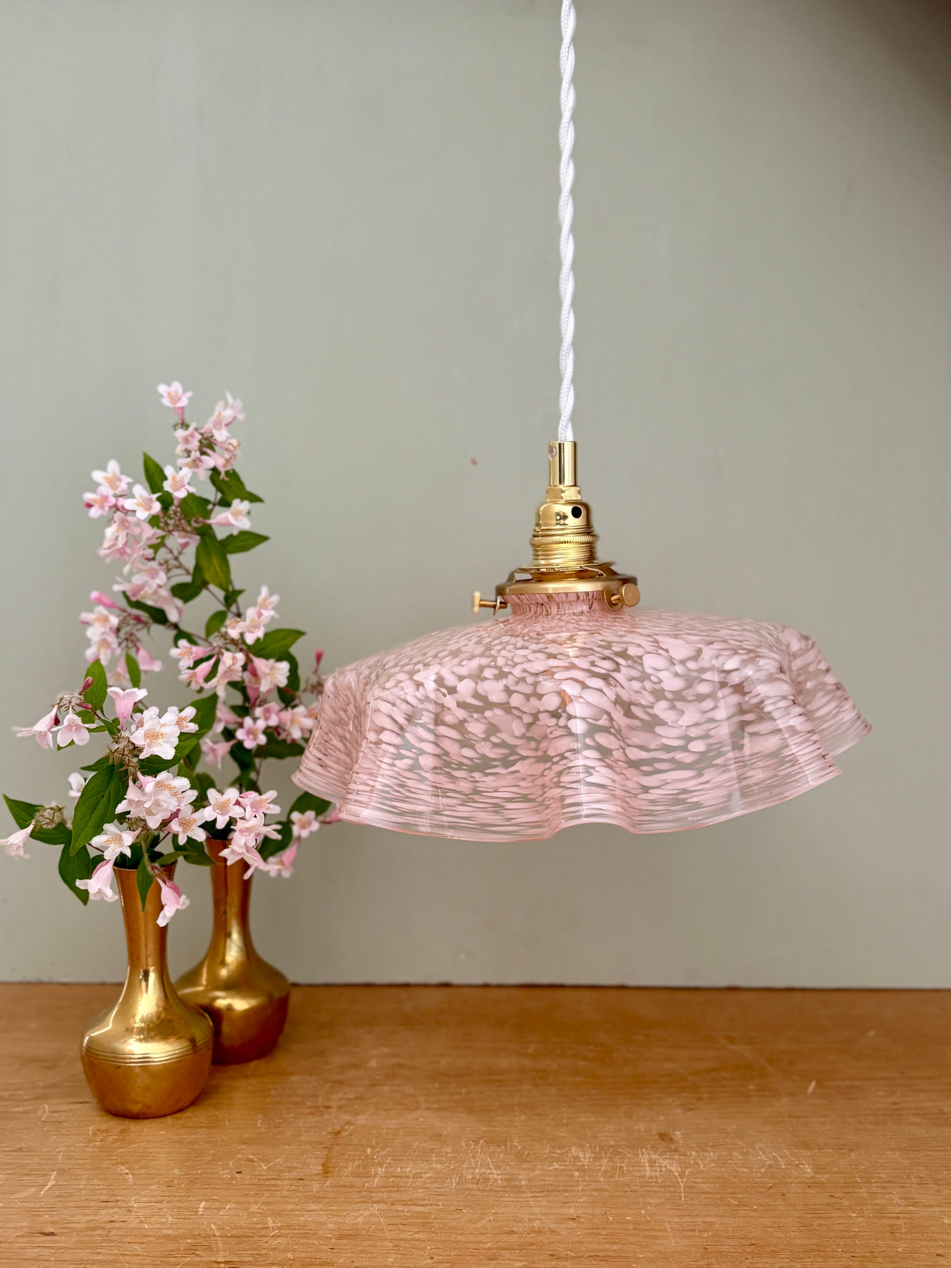 Jolie suspension avec abat-jour vintage en verre de Clichy rose.