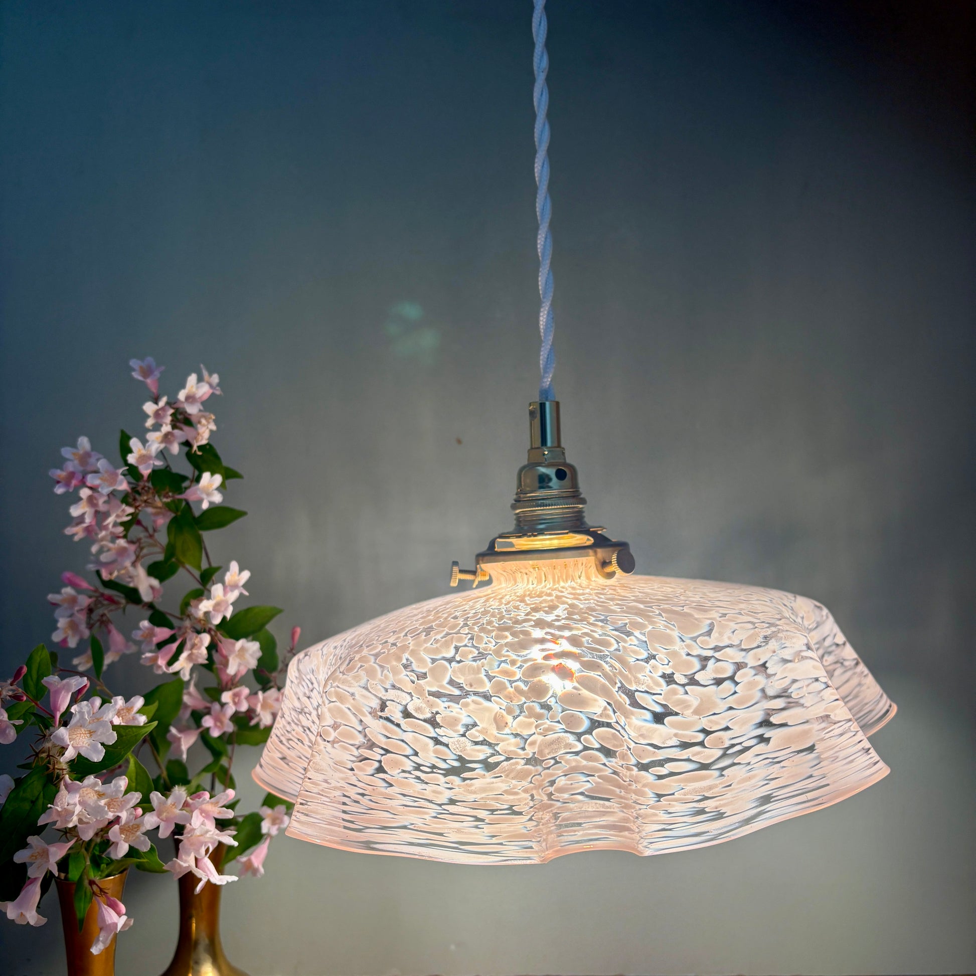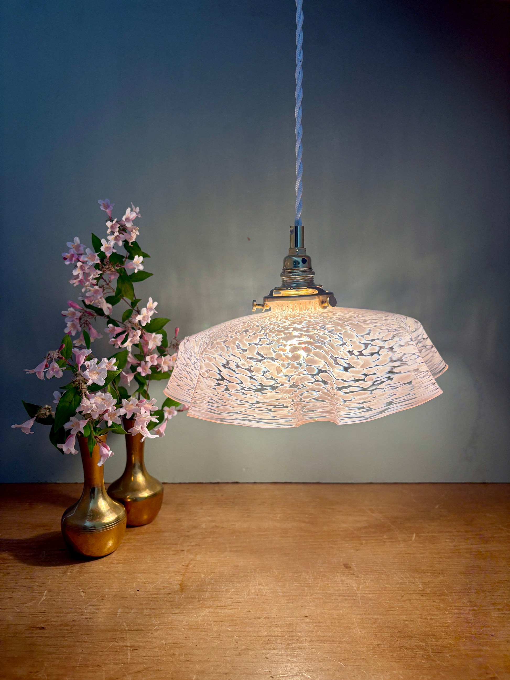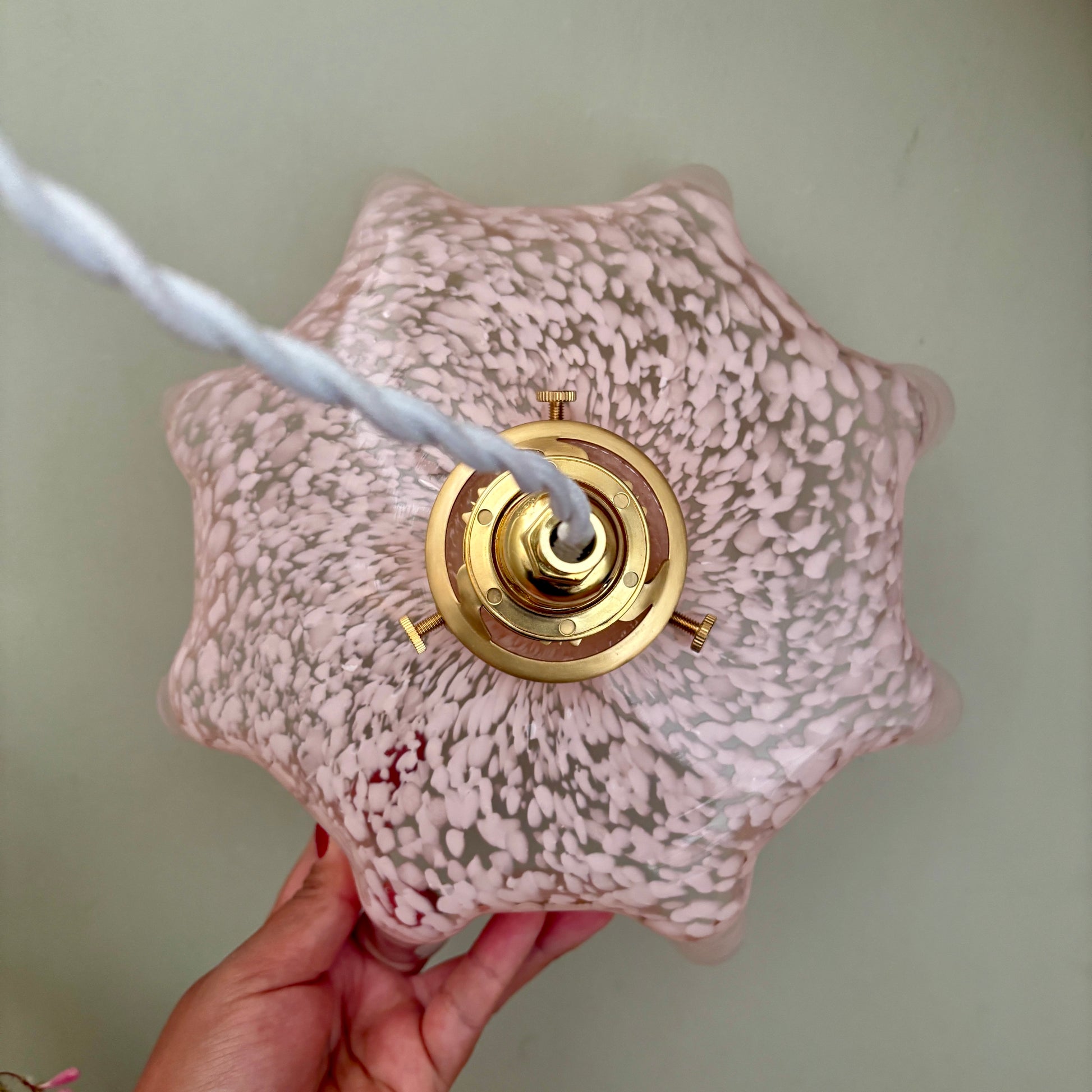 Jolie suspension avec abat-jour vintage en verre de Clichy rose.