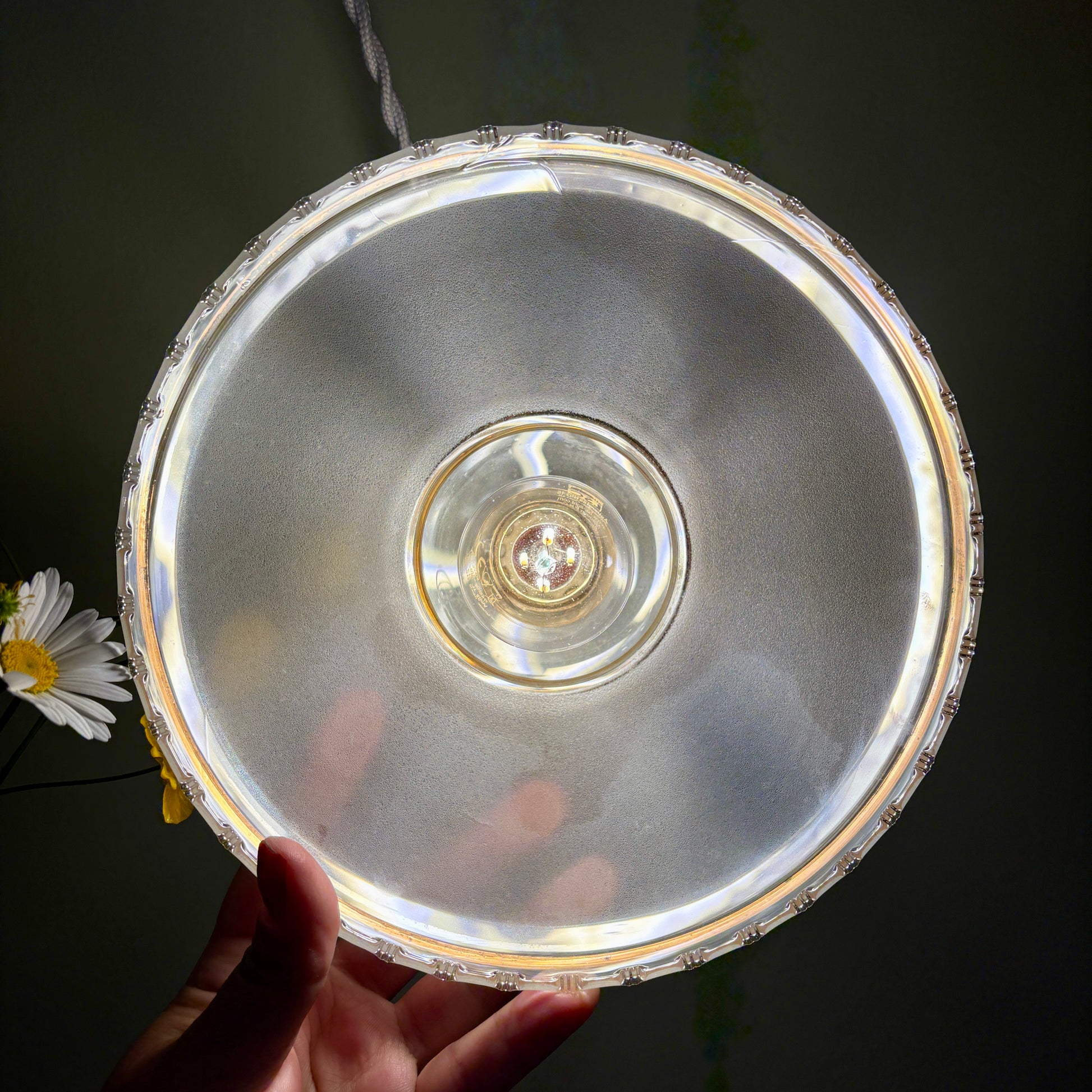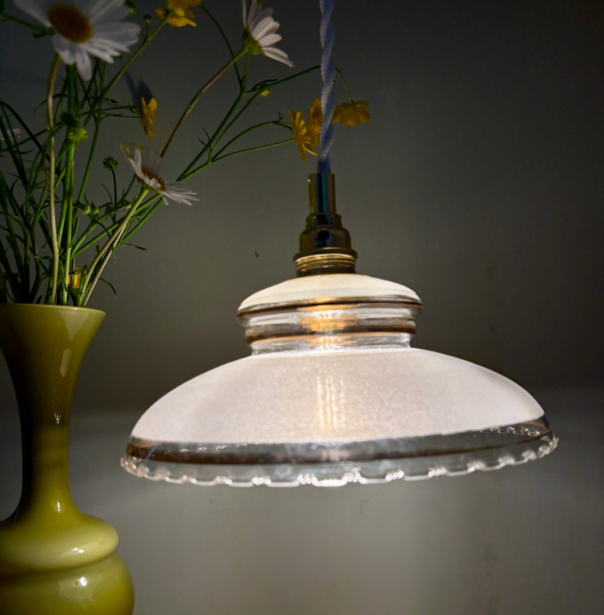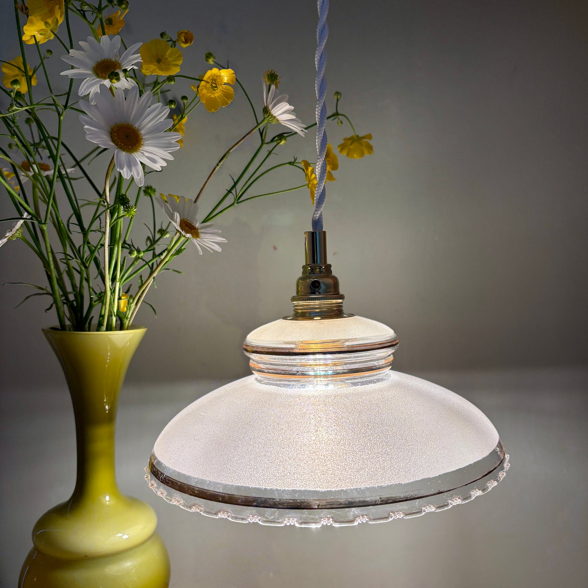 Jolie suspension avec abat-jour vintage en verre granité blanc et liserés dorés.