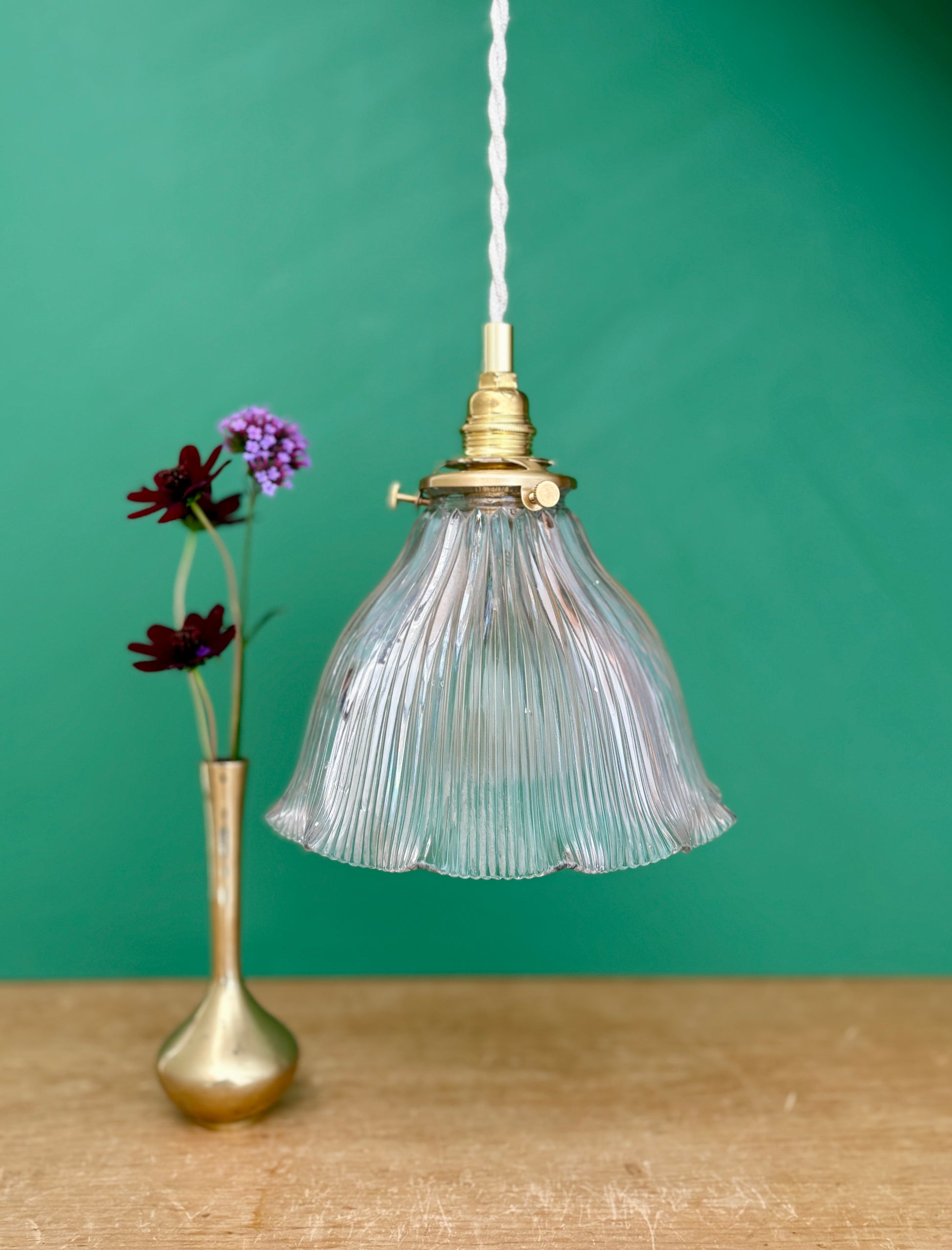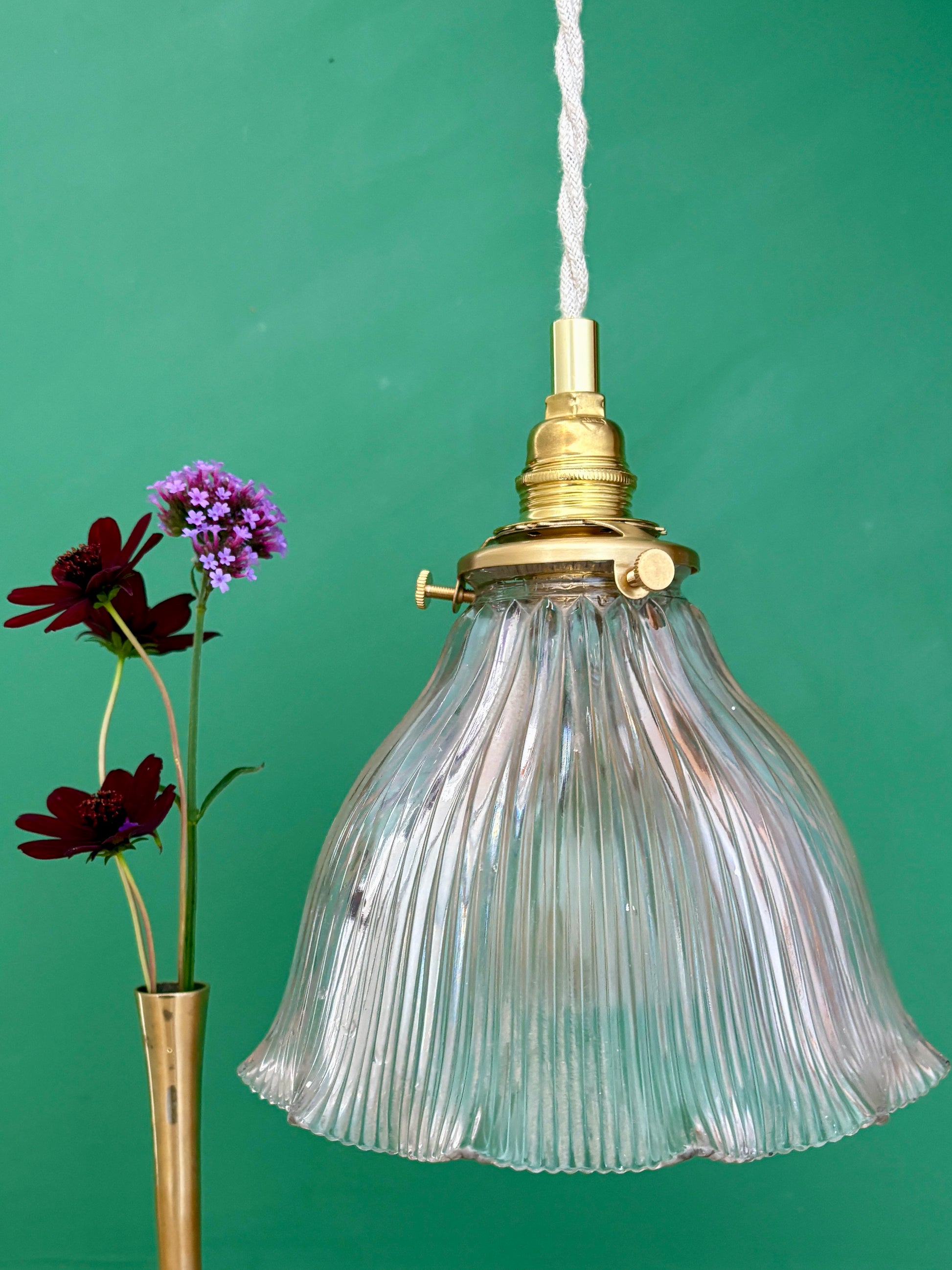 Magnifique suspension avec abat-jour vintage en verre holophane. Un verre épais et en relief.