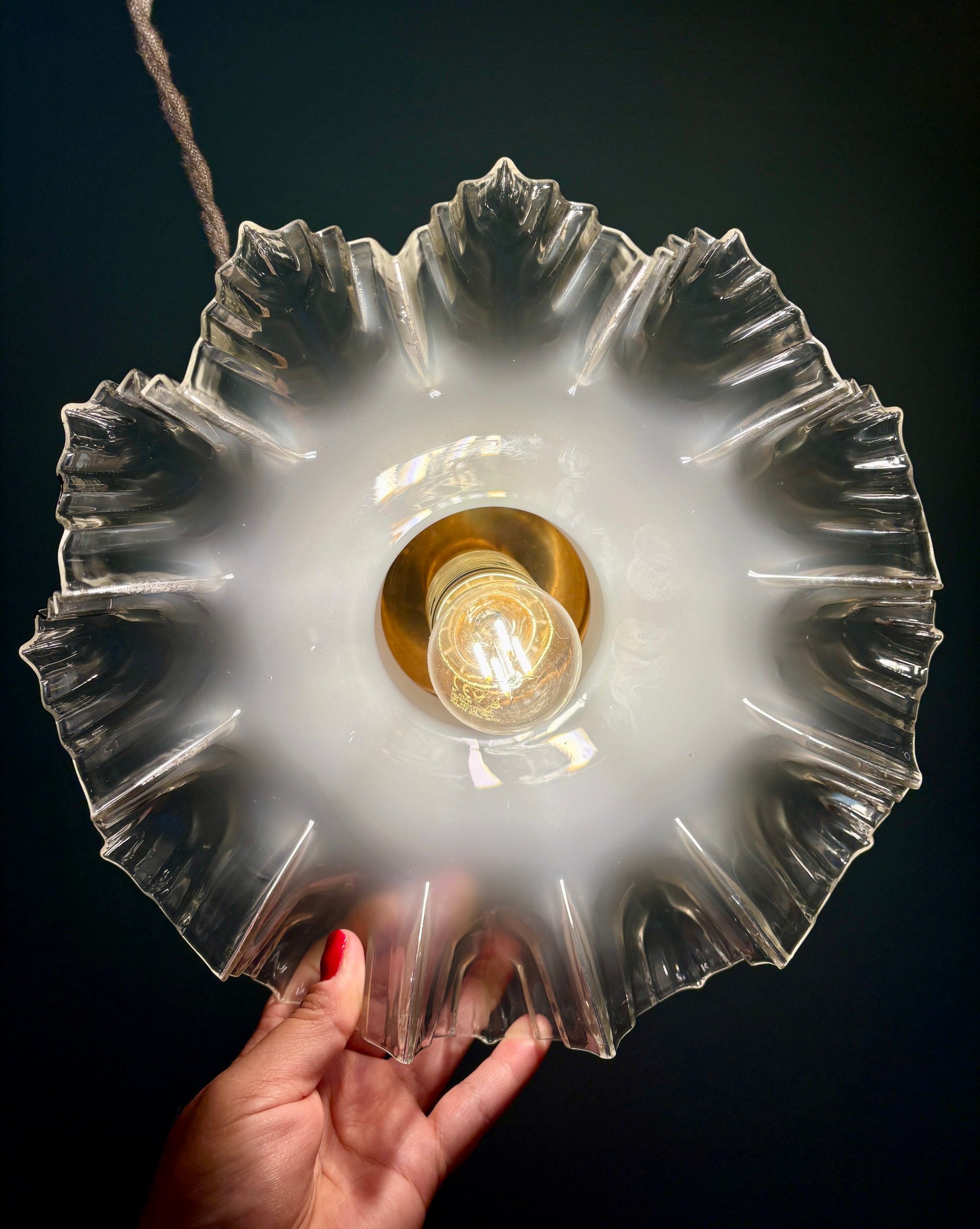 Suspension abat-jour vintage dentelle en verre mi blanc mi transparent
