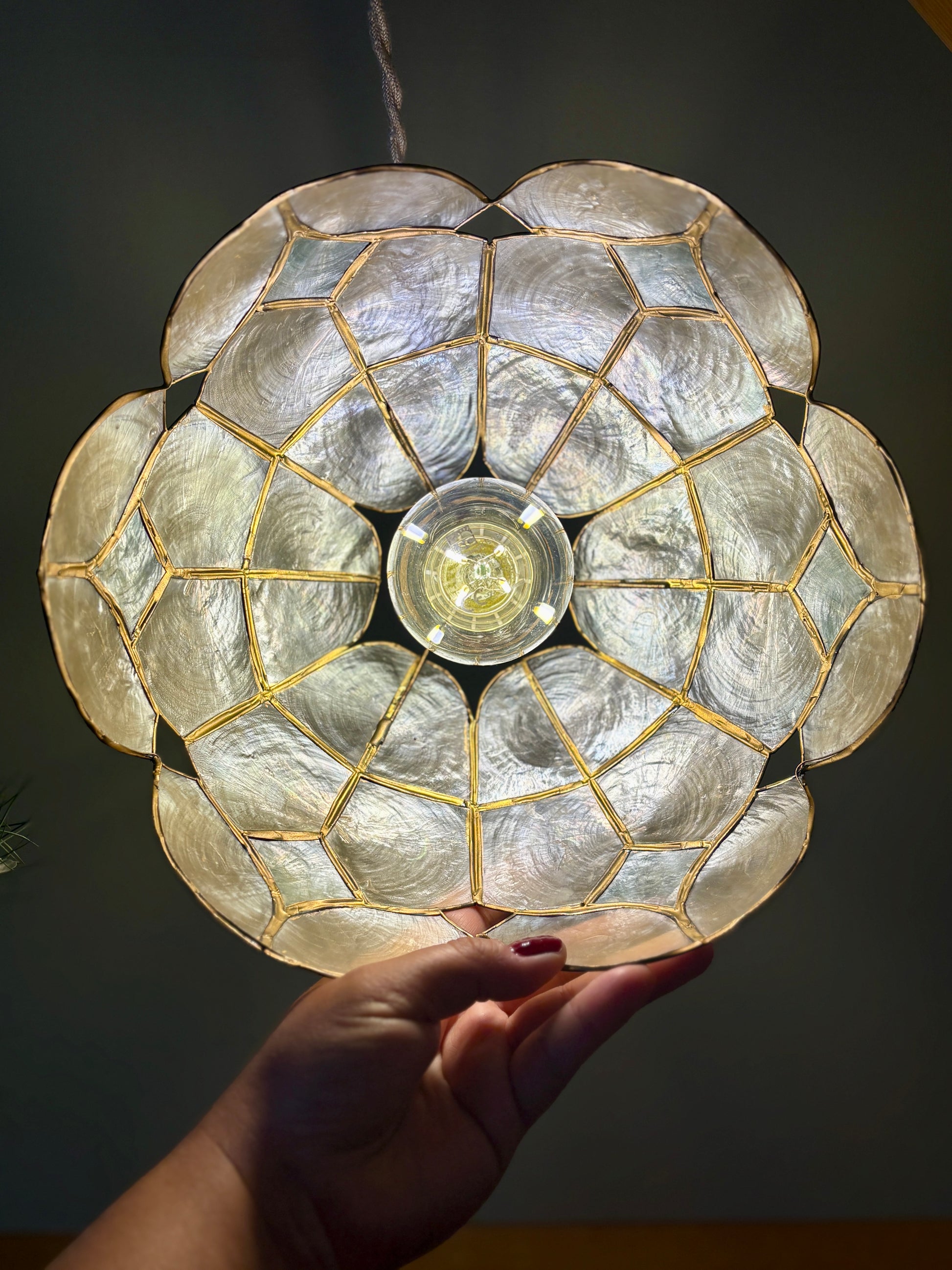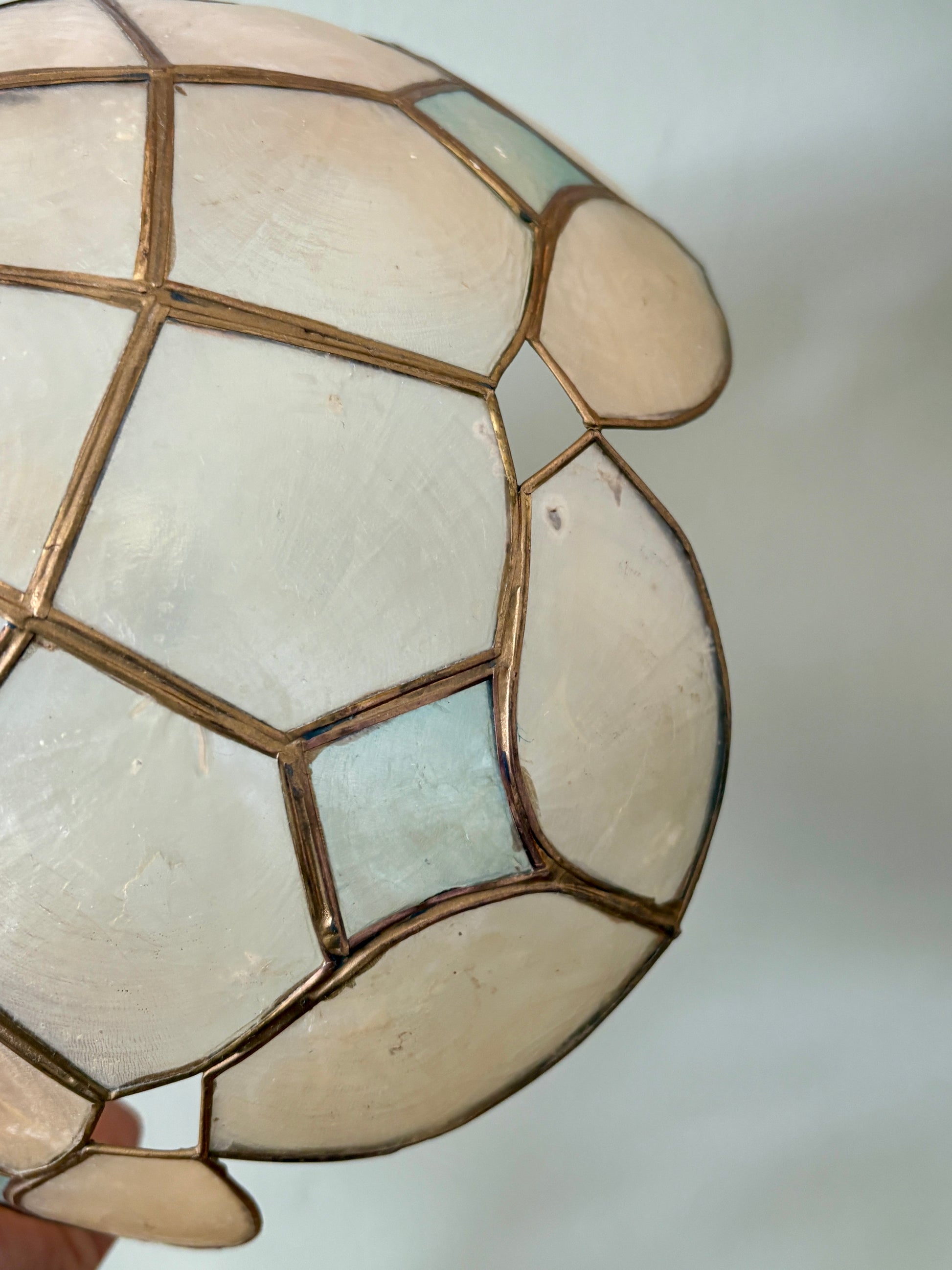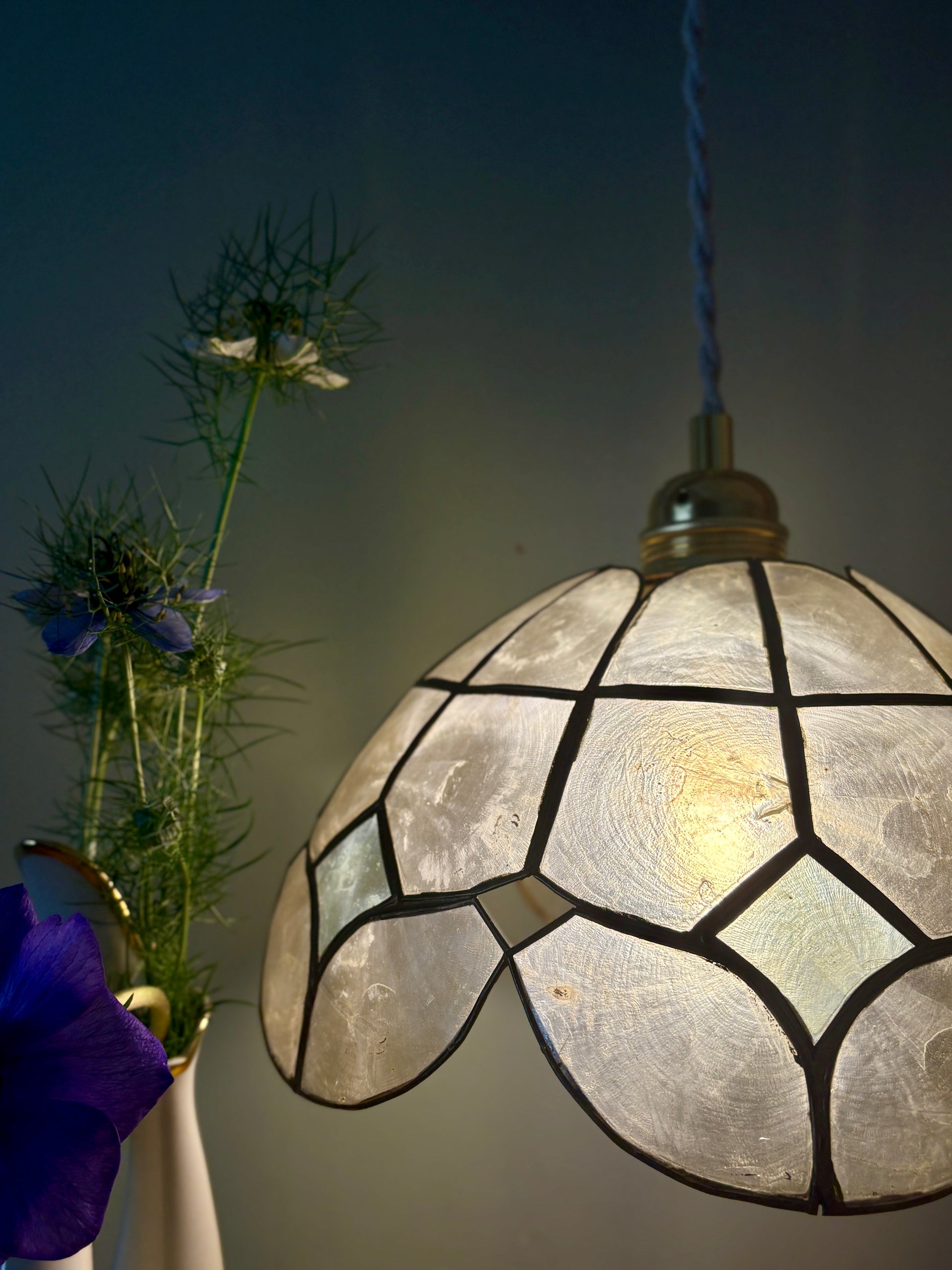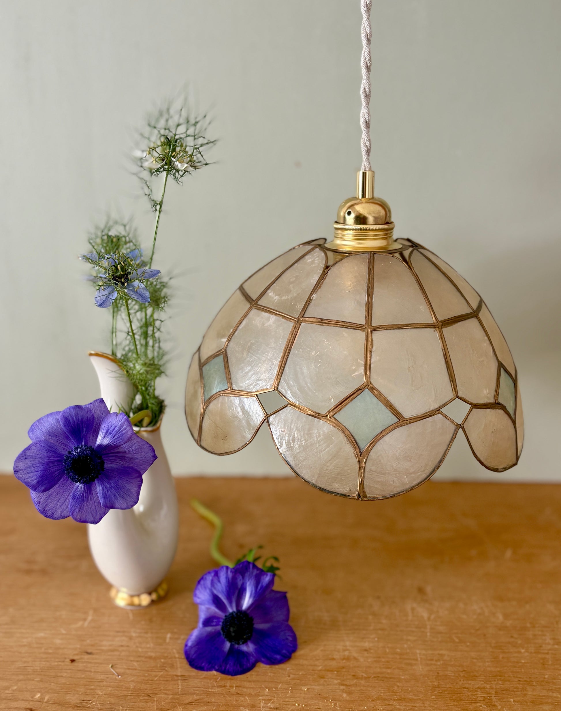 Jolie suspension avec abat-jour vintage en nacre beige et bleue et laiton.