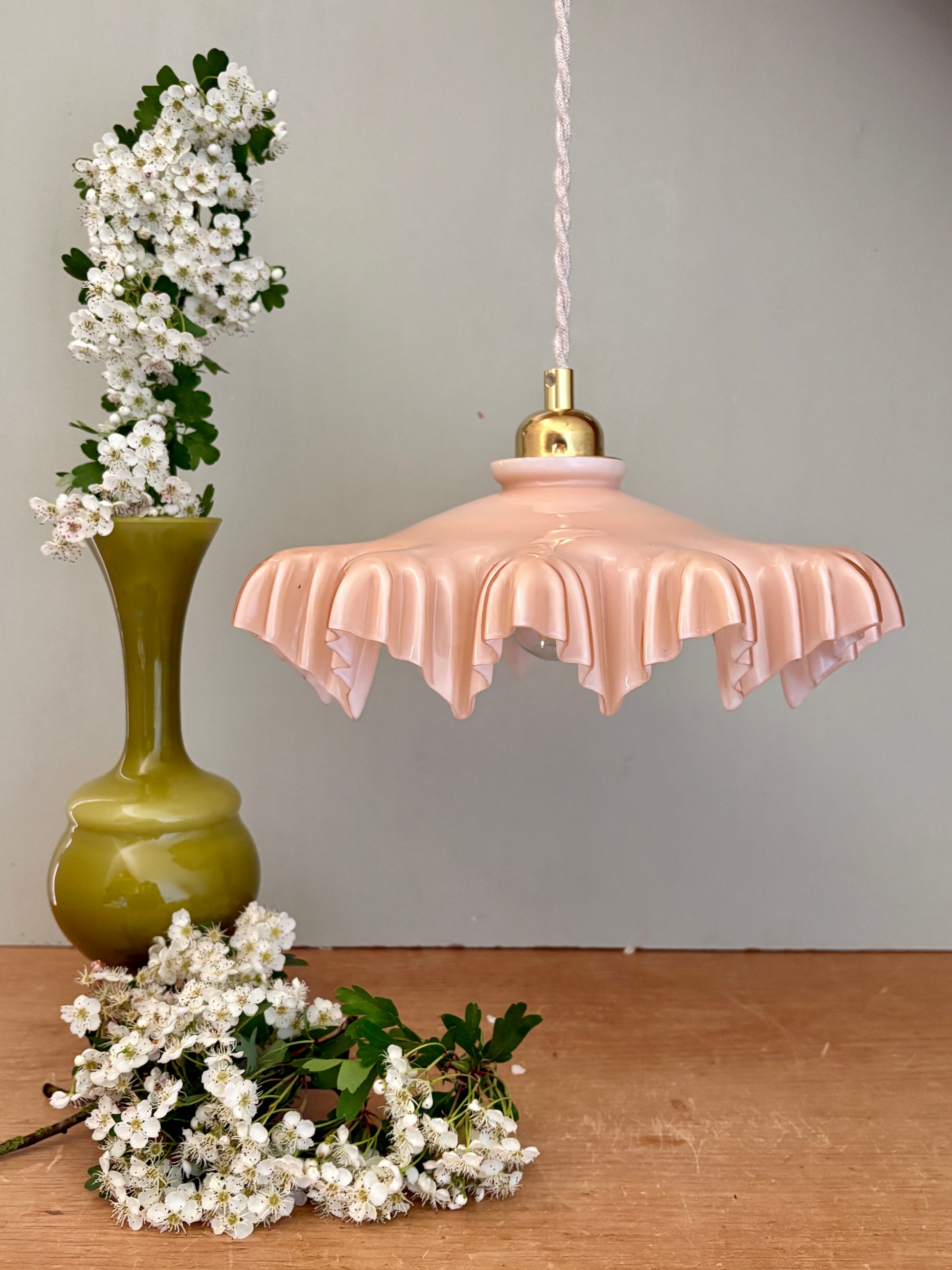 Jolie suspension avec abat-jour vintage en opaline rose pâle.