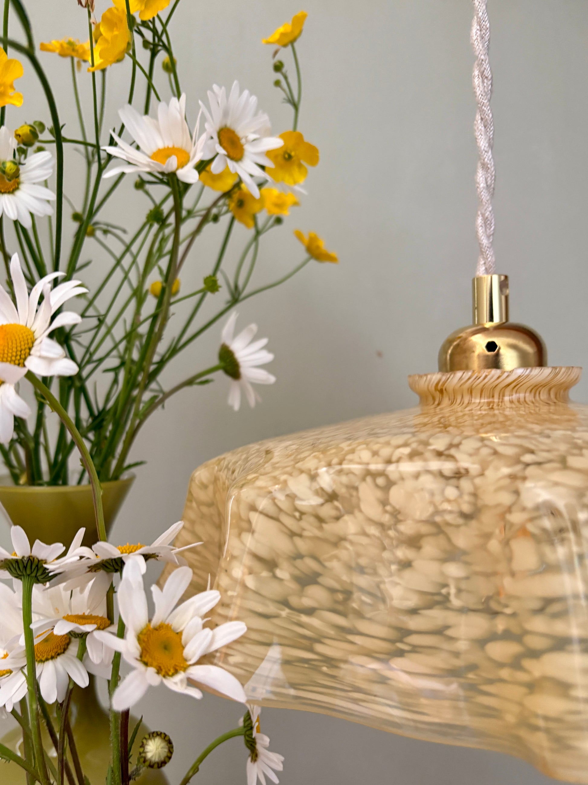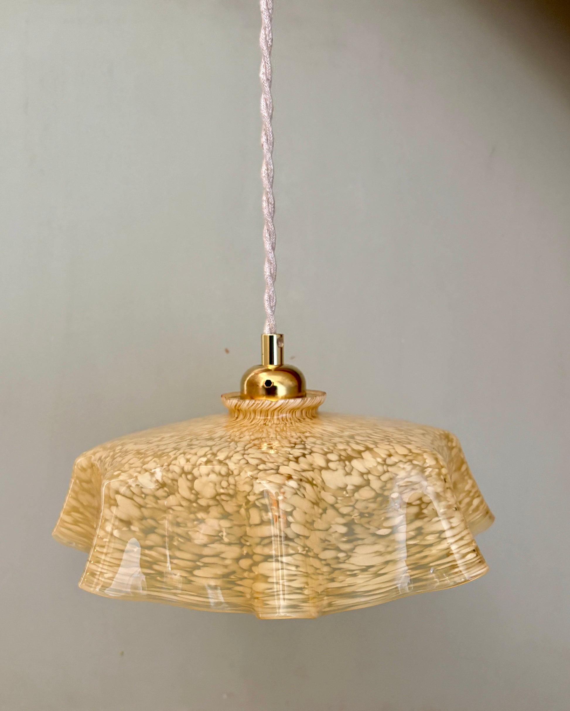 Jolie suspension avec abat-jour vintage en verre de Clichy jaune pâle.