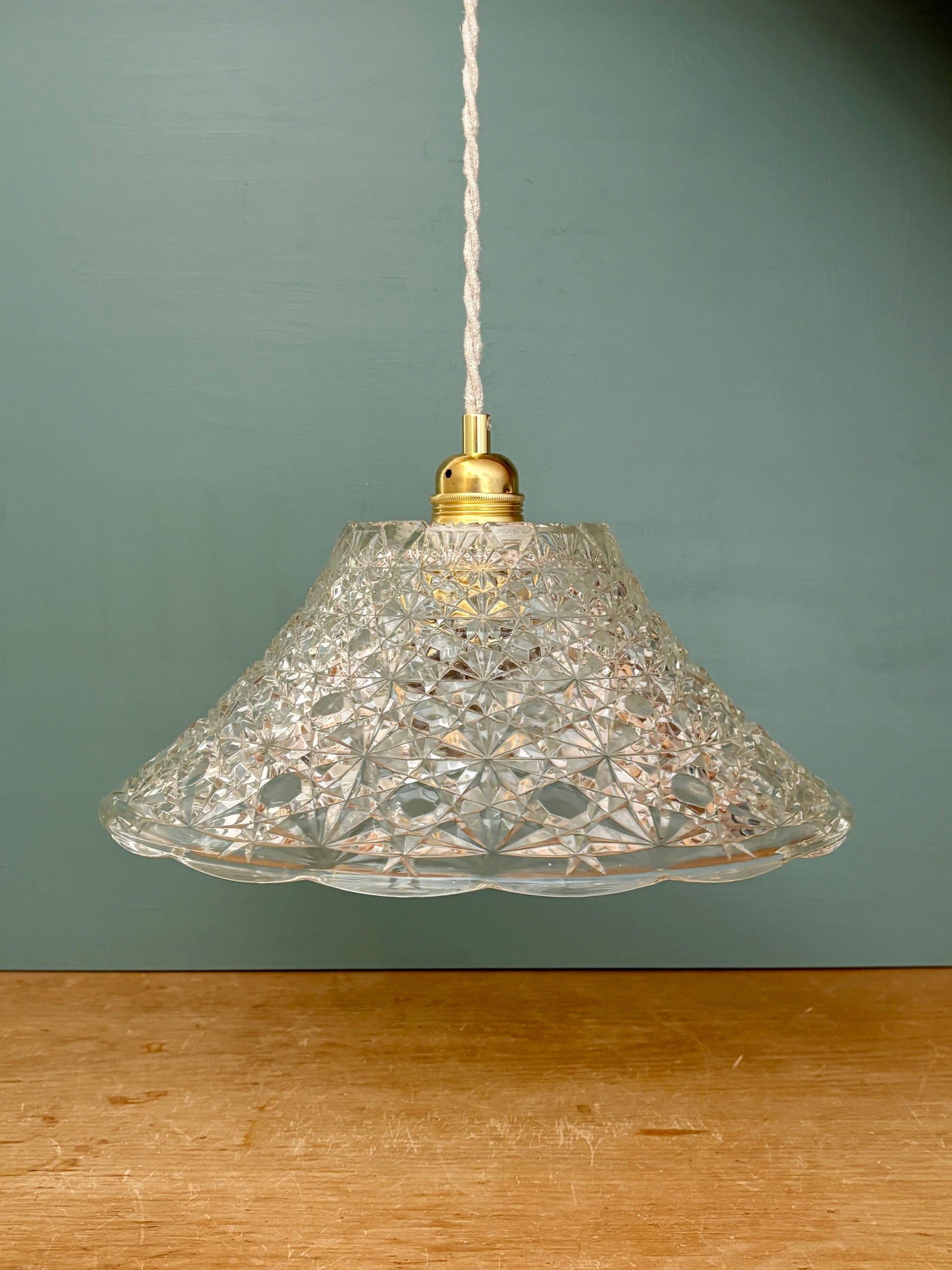 Belle suspension réalisée à partir de vaisselle ancienne en verre moulé.