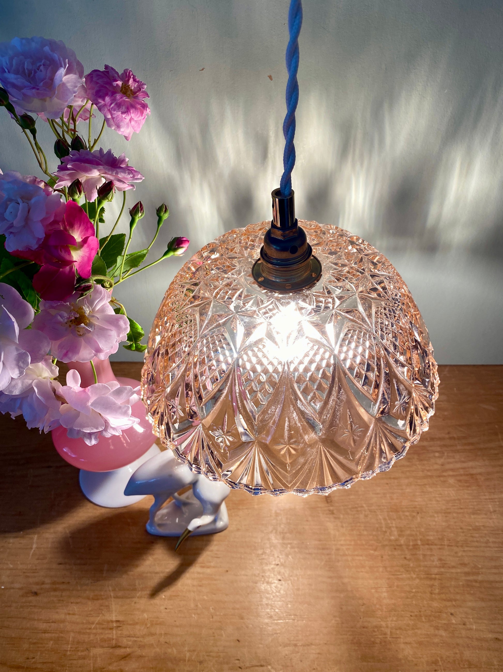 Suspension abat-jour vintage en verre moulé rose - collection vaisselle -