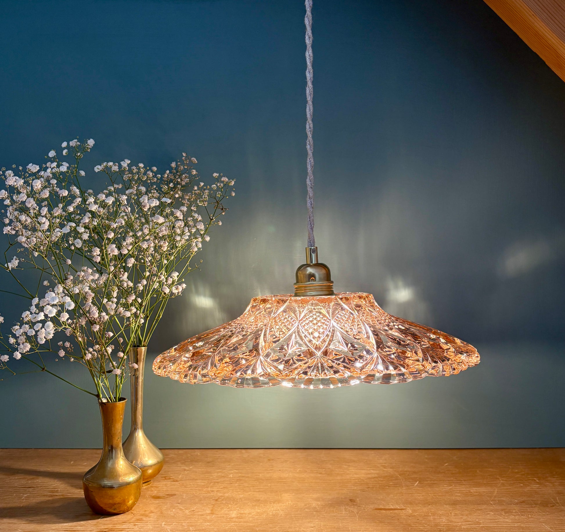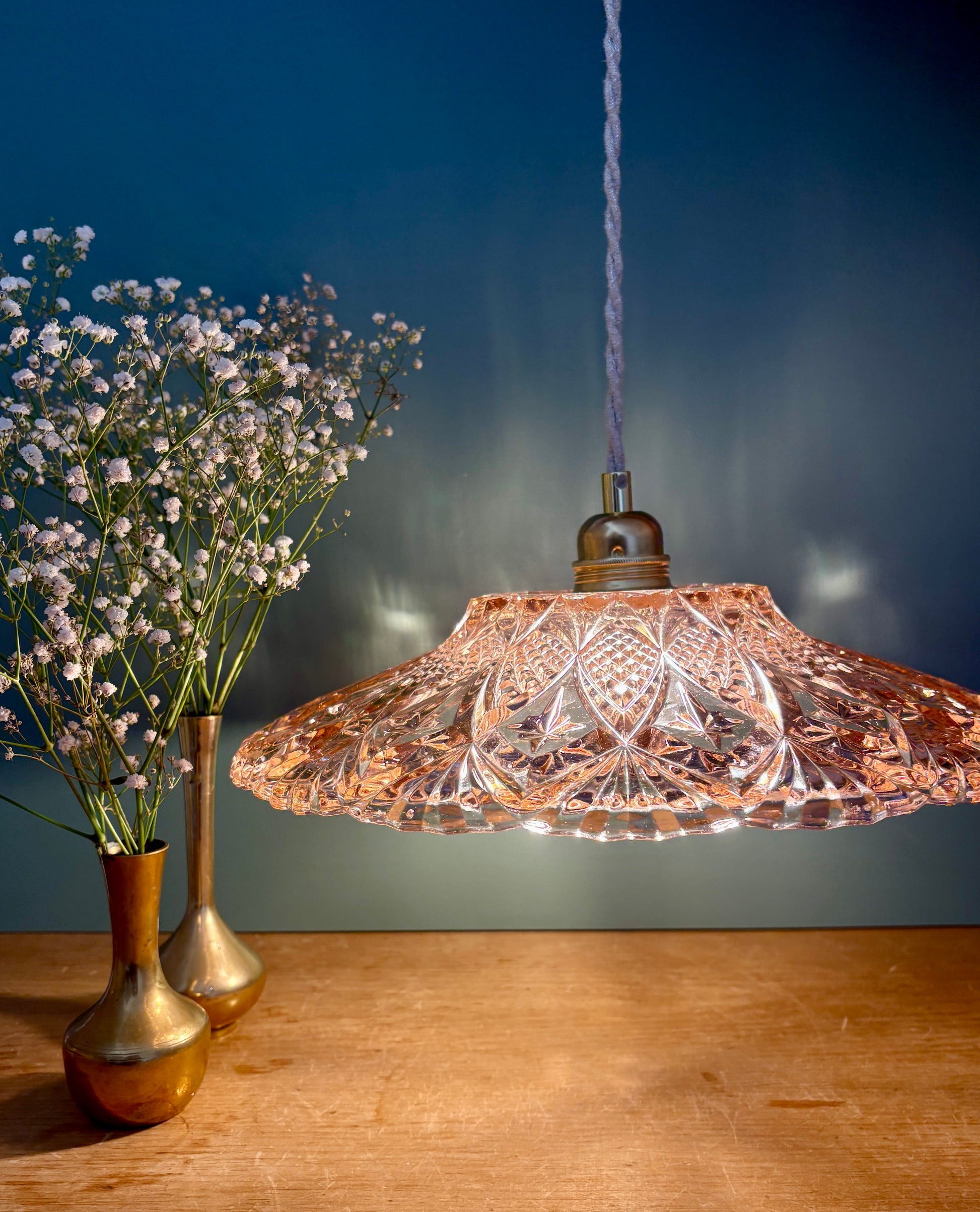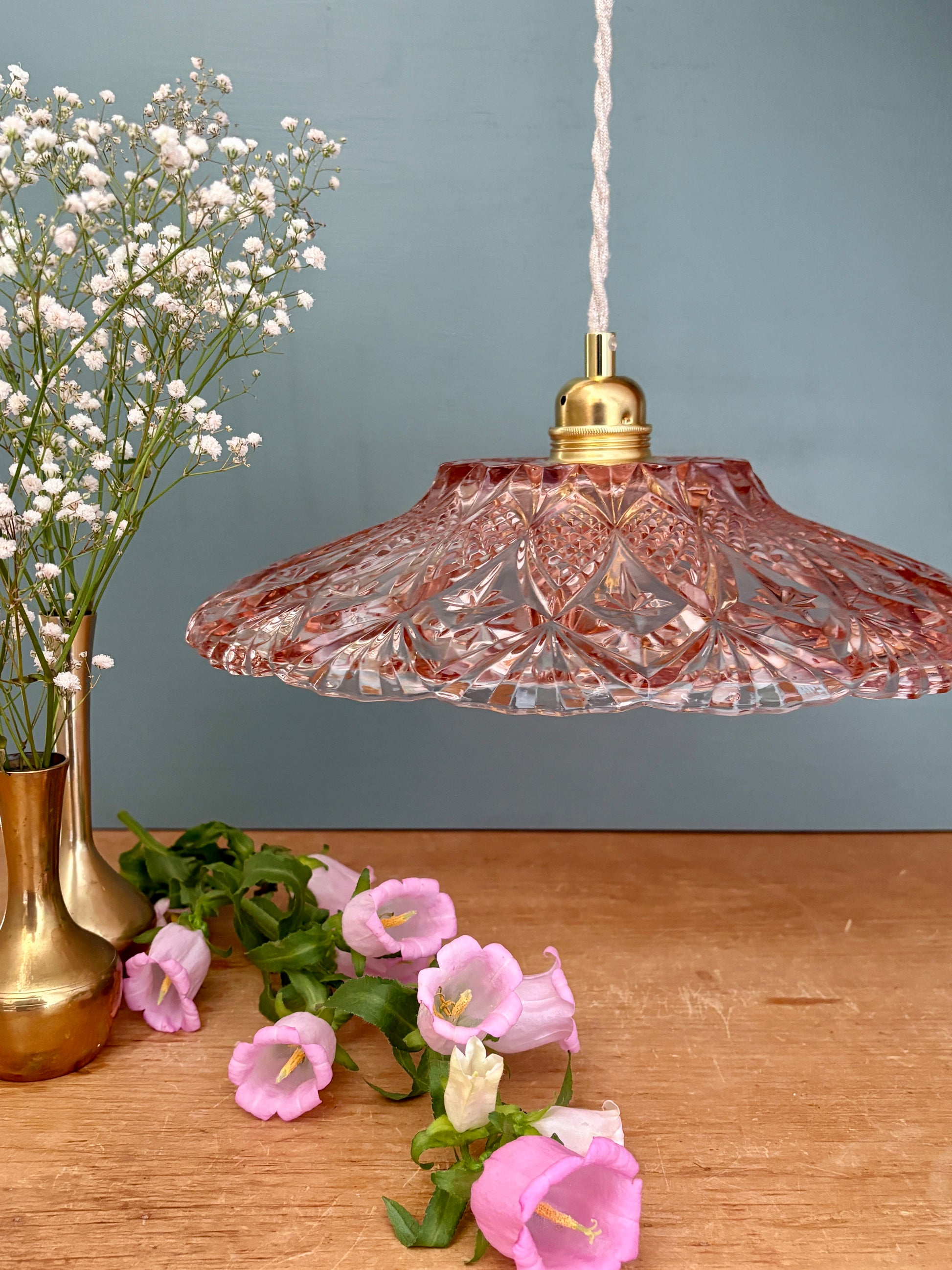 Suspension abat-jour vintage en verre moulé rose - collection vaisselle -