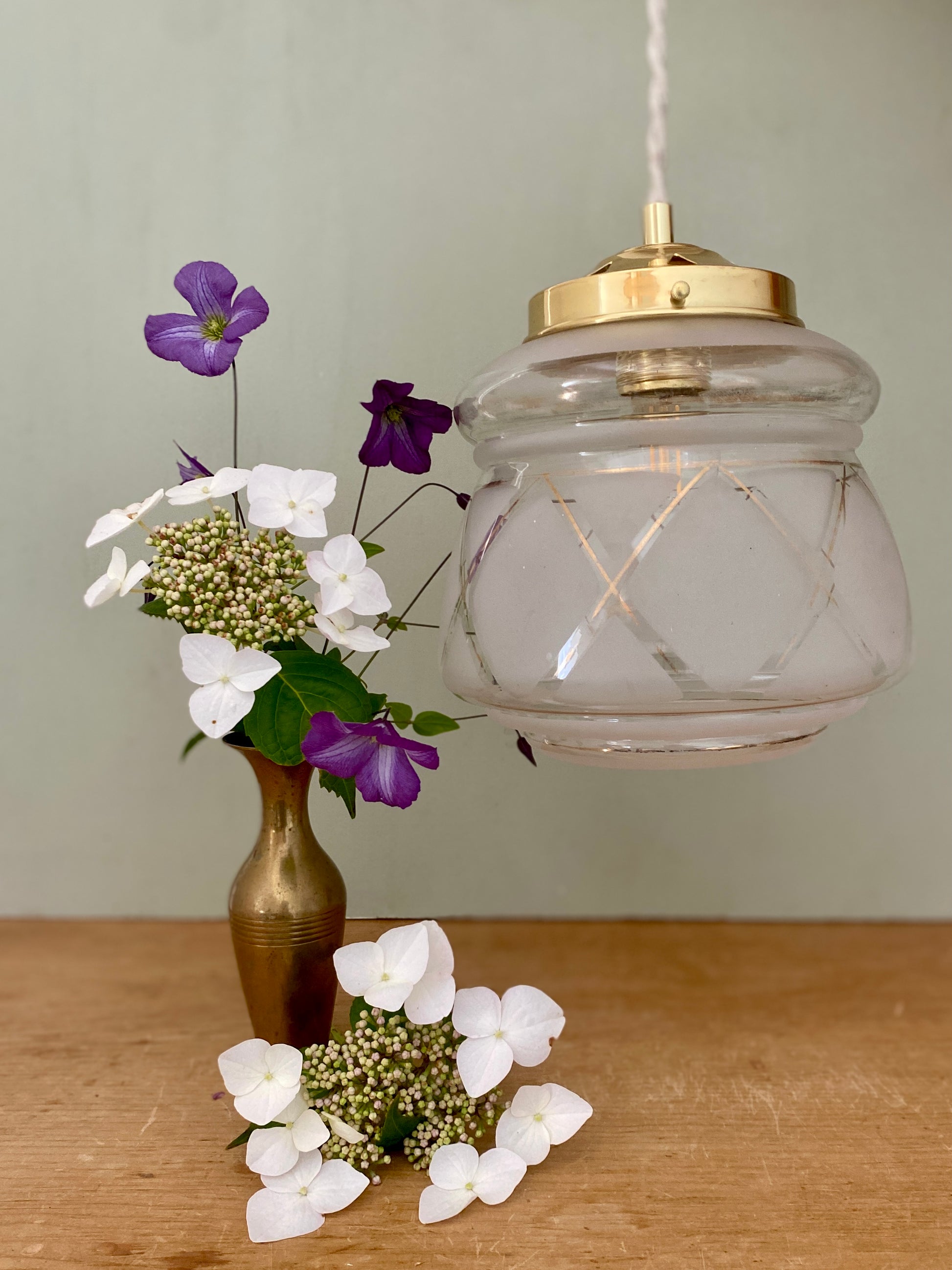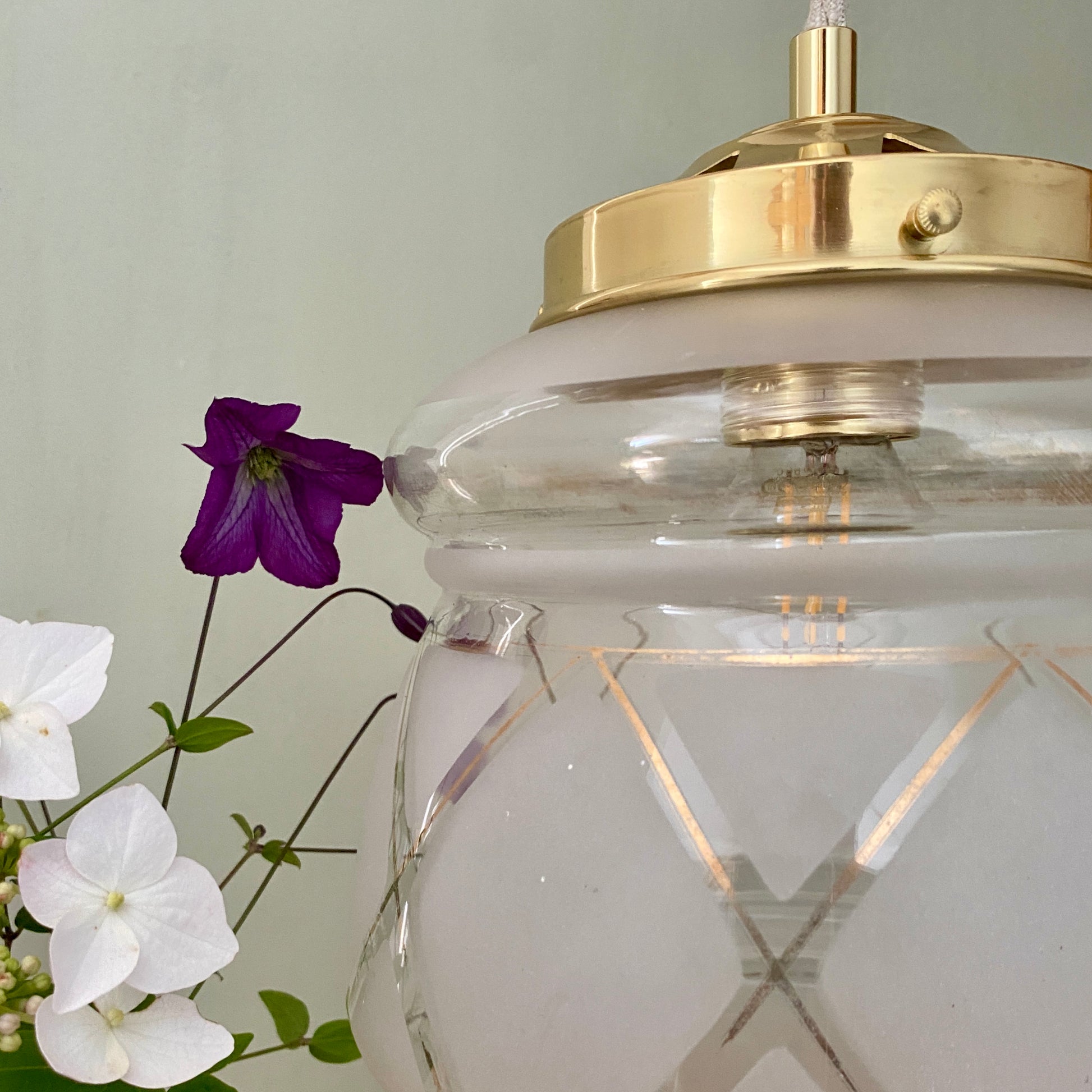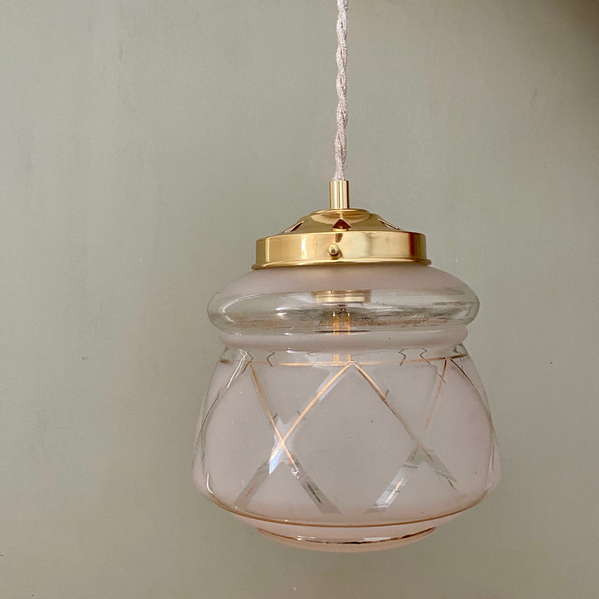 Très belle suspension avec globe vintage art déco en verre dépoli blanc avec liserés dorés.