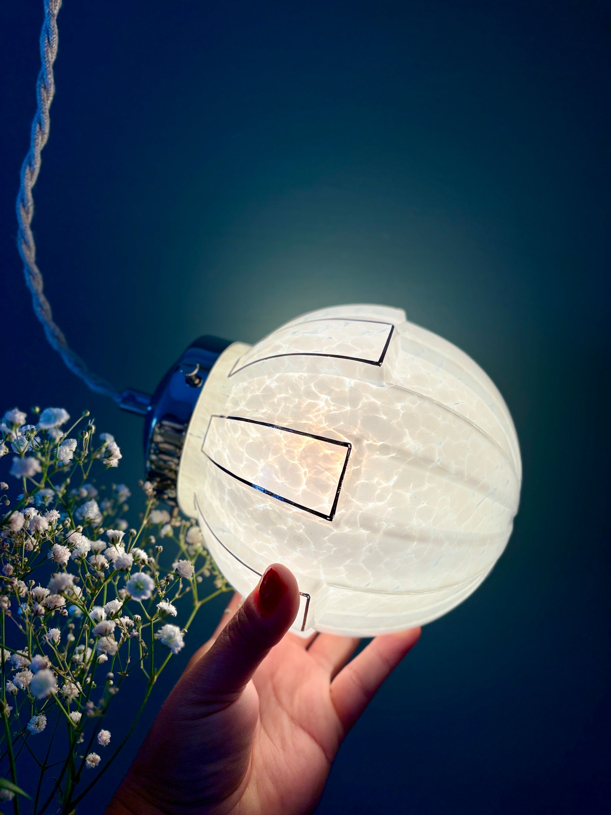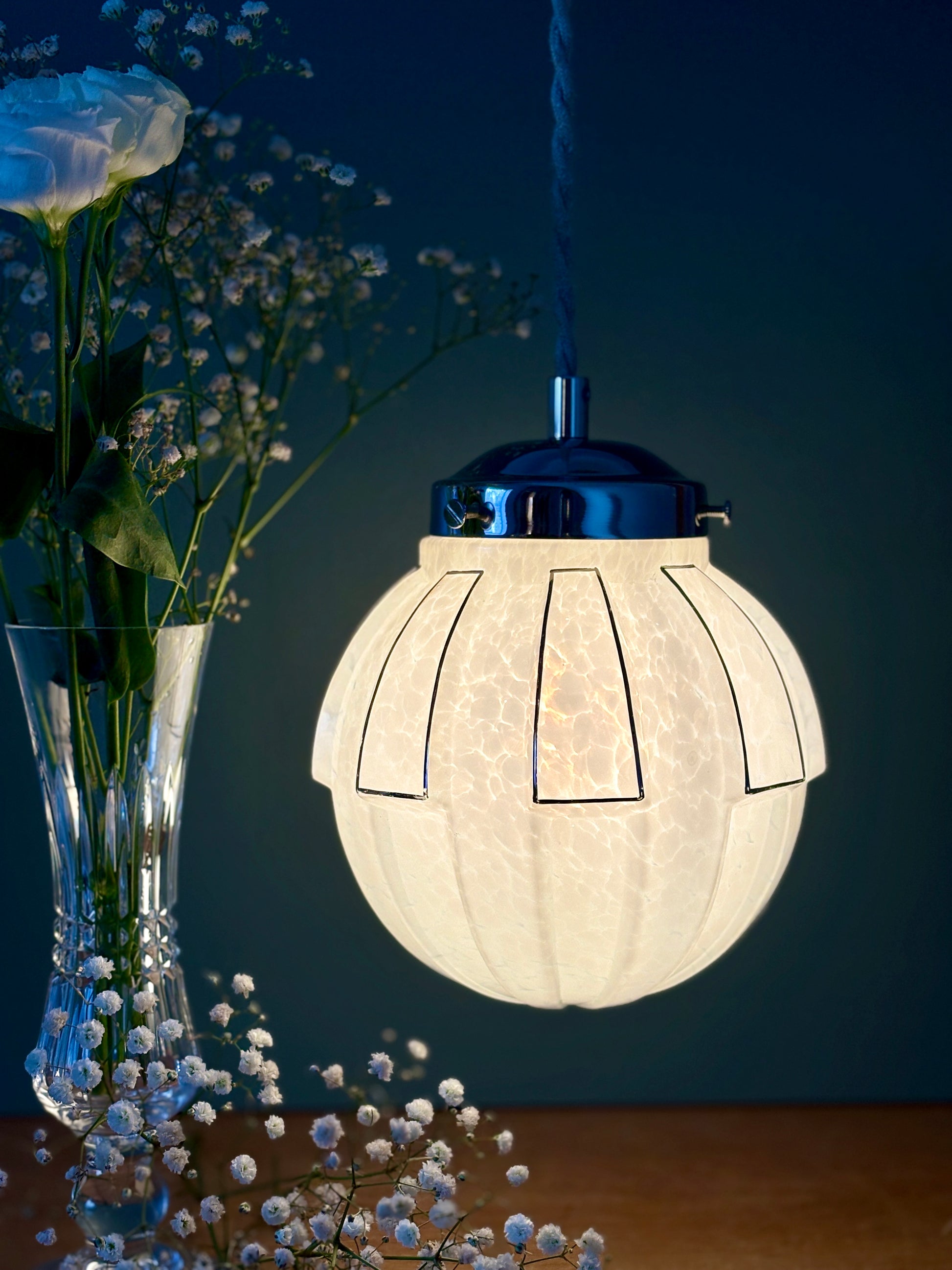 Suspension globe vintage art déco en verre de Clichy blanc et argent