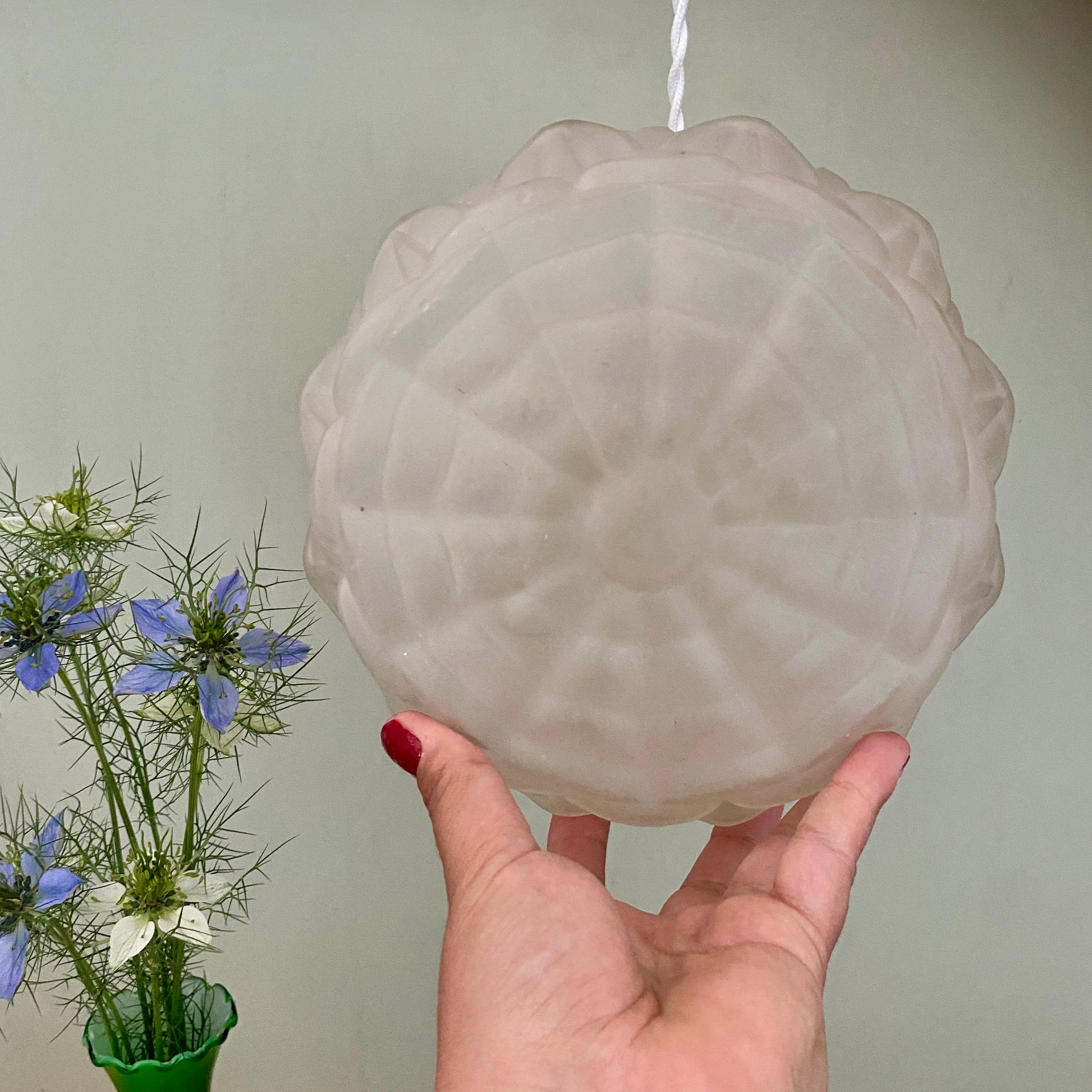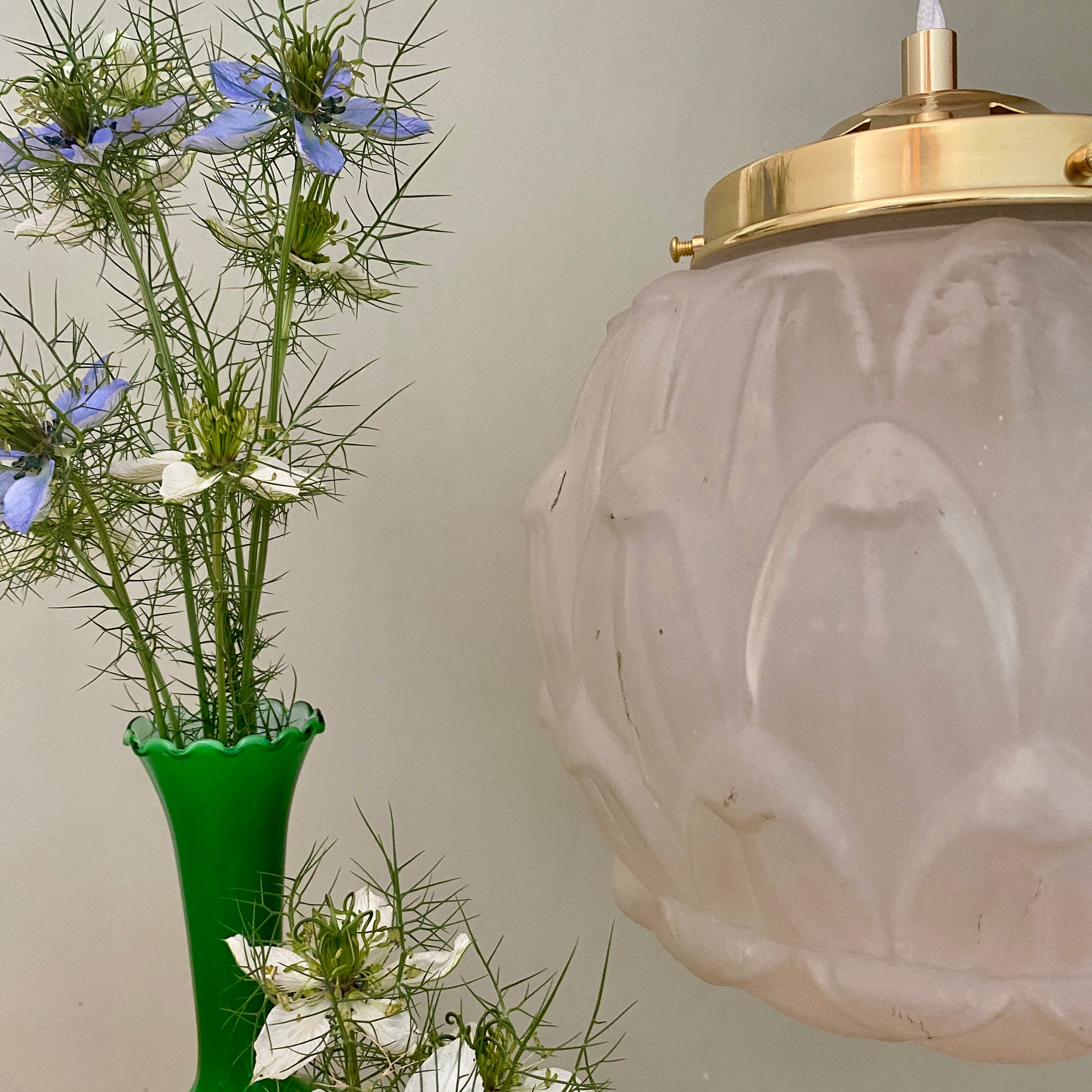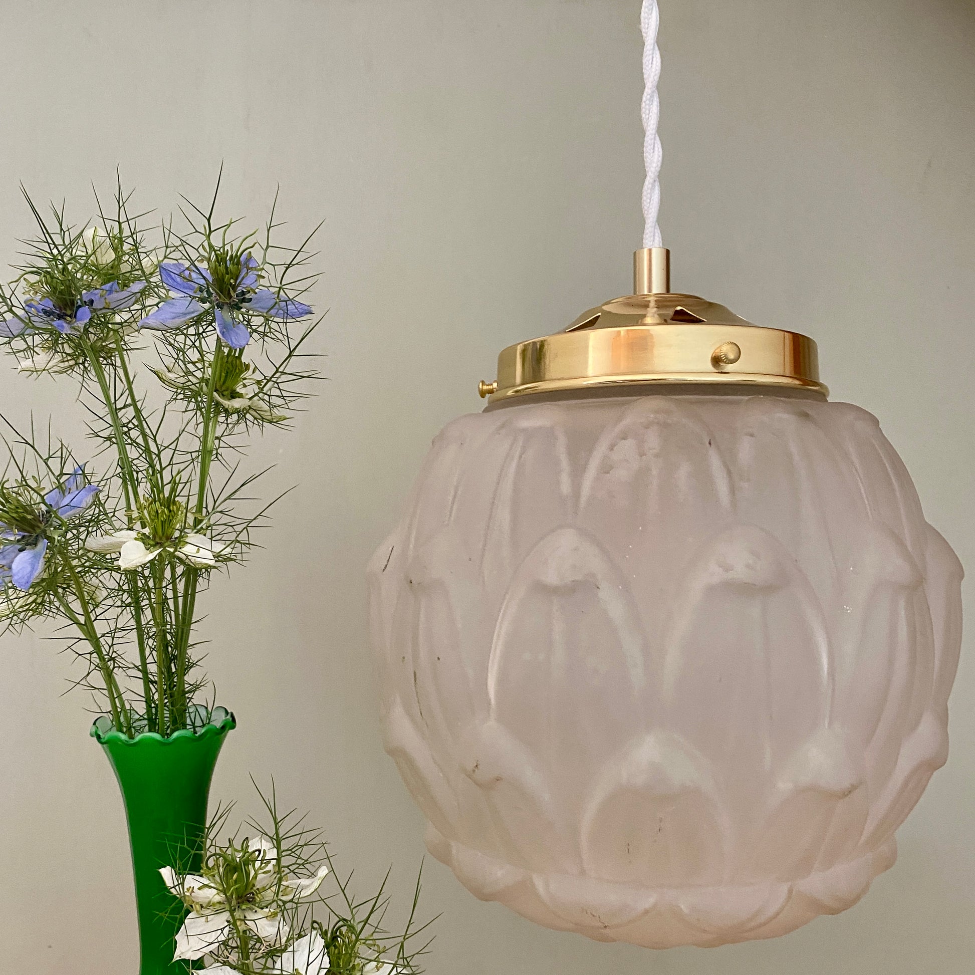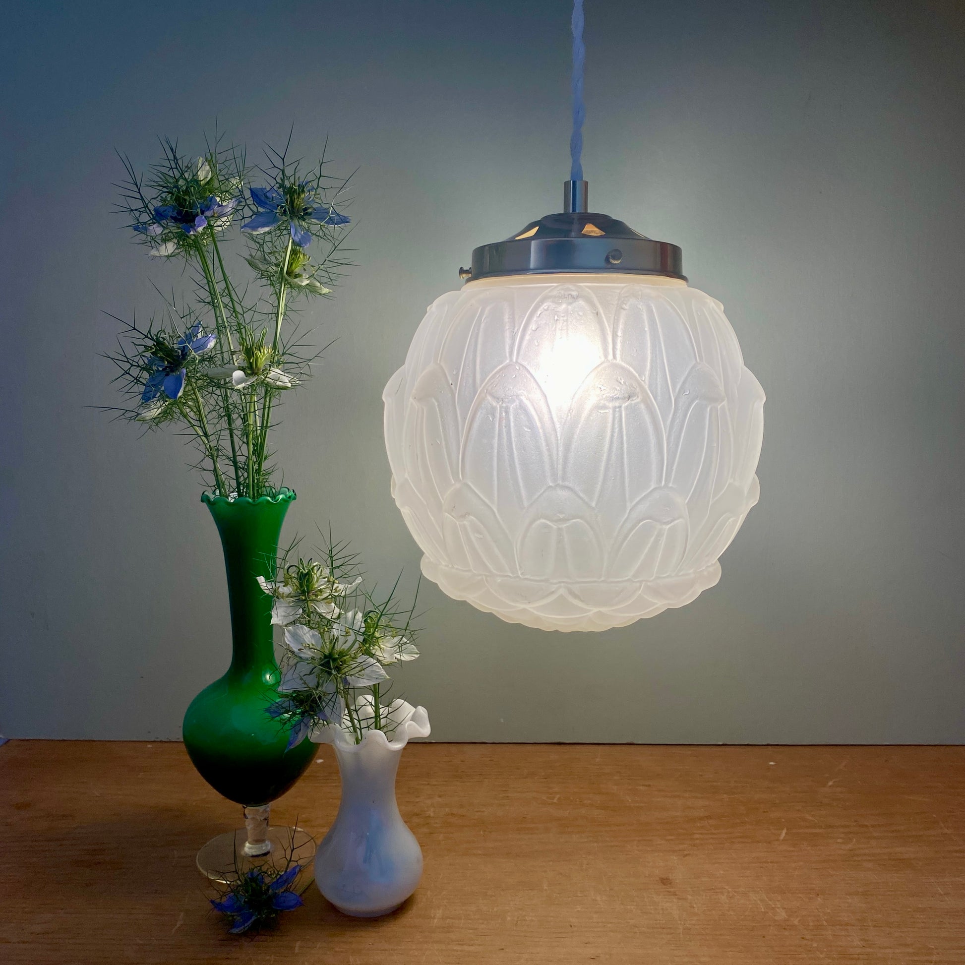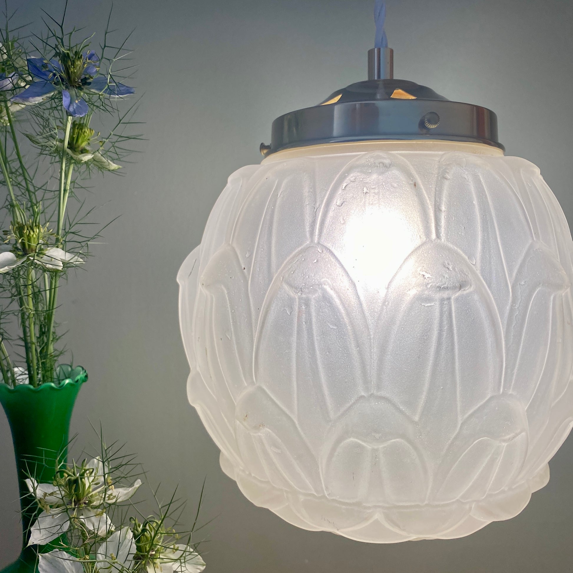 Magnifique suspension globe vintage art déco - en verre dépoli - décors de pétales en relief.