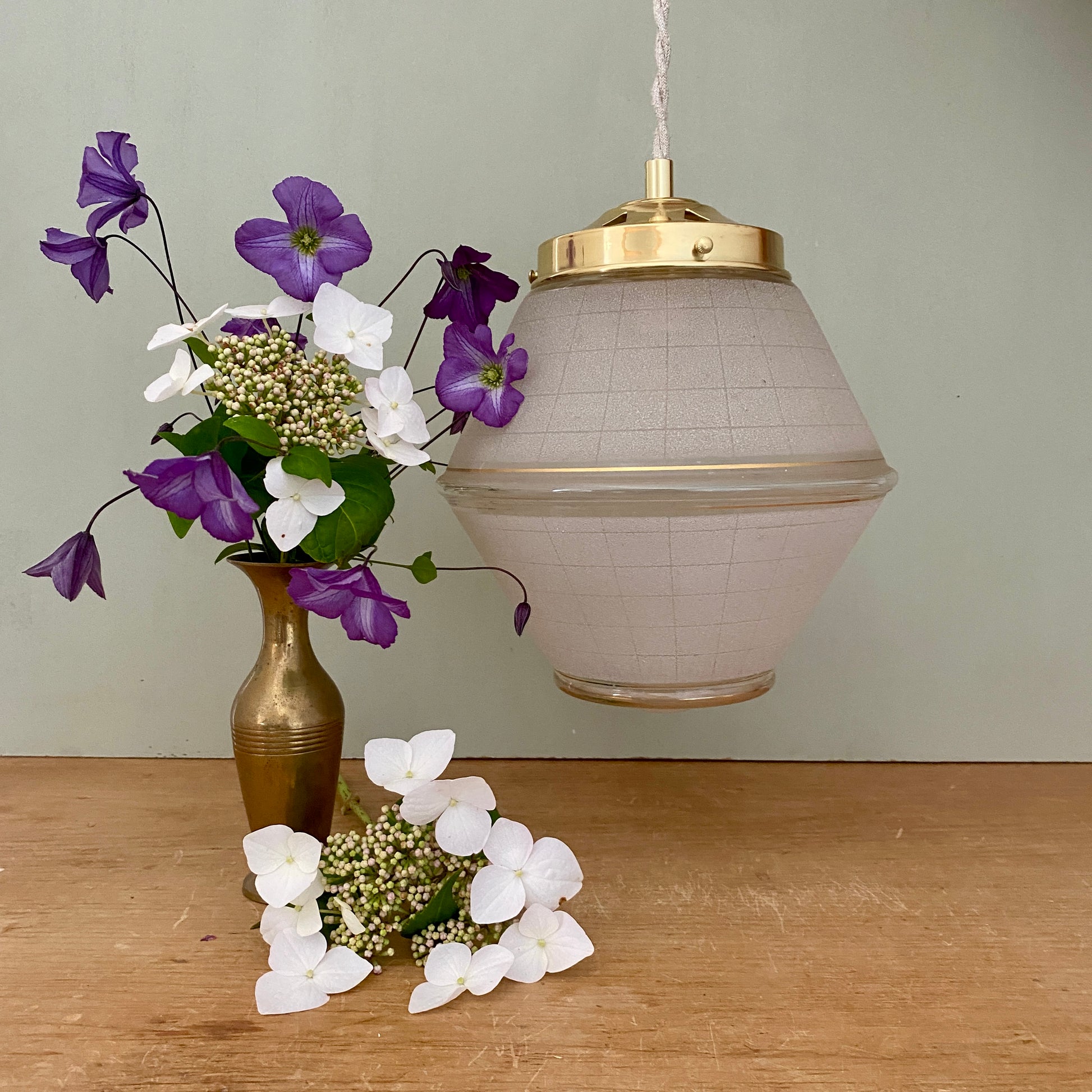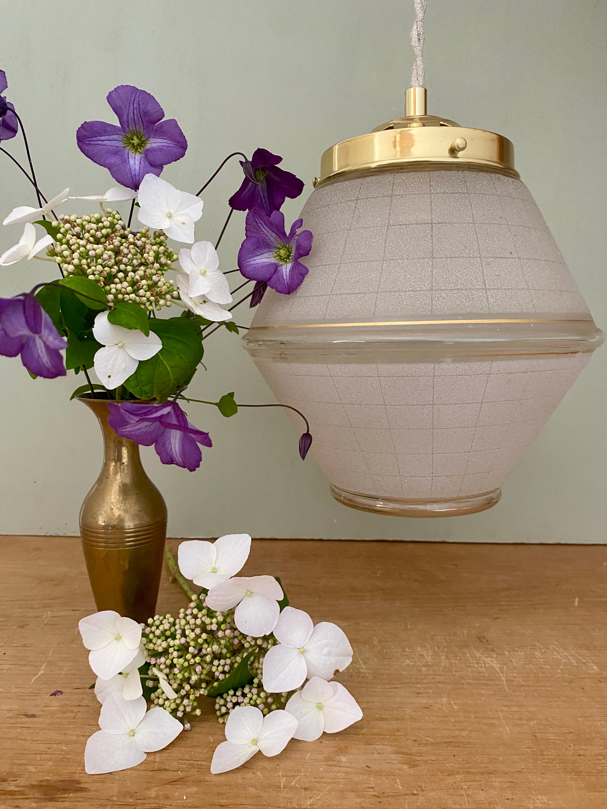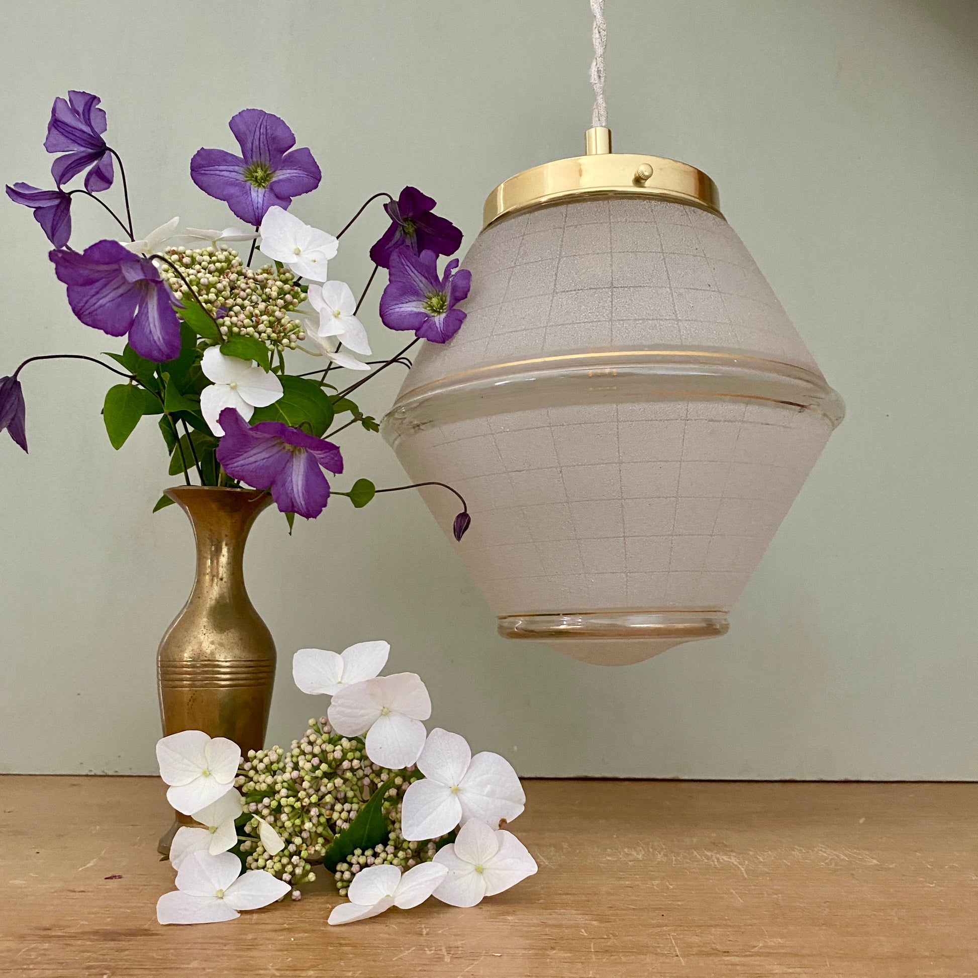 Belle suspension avec globe vintage art déco en verre givré blanc et doré.
