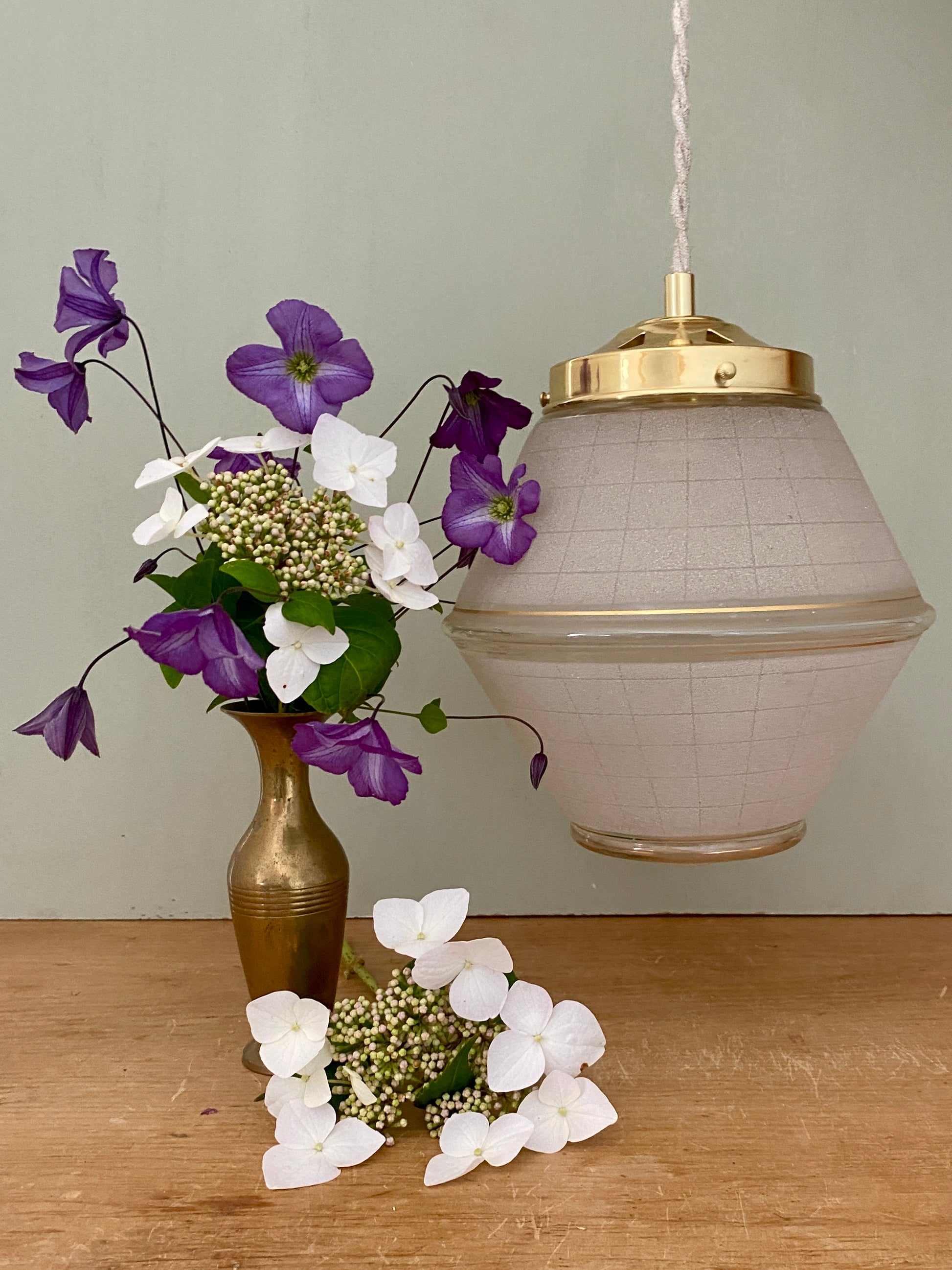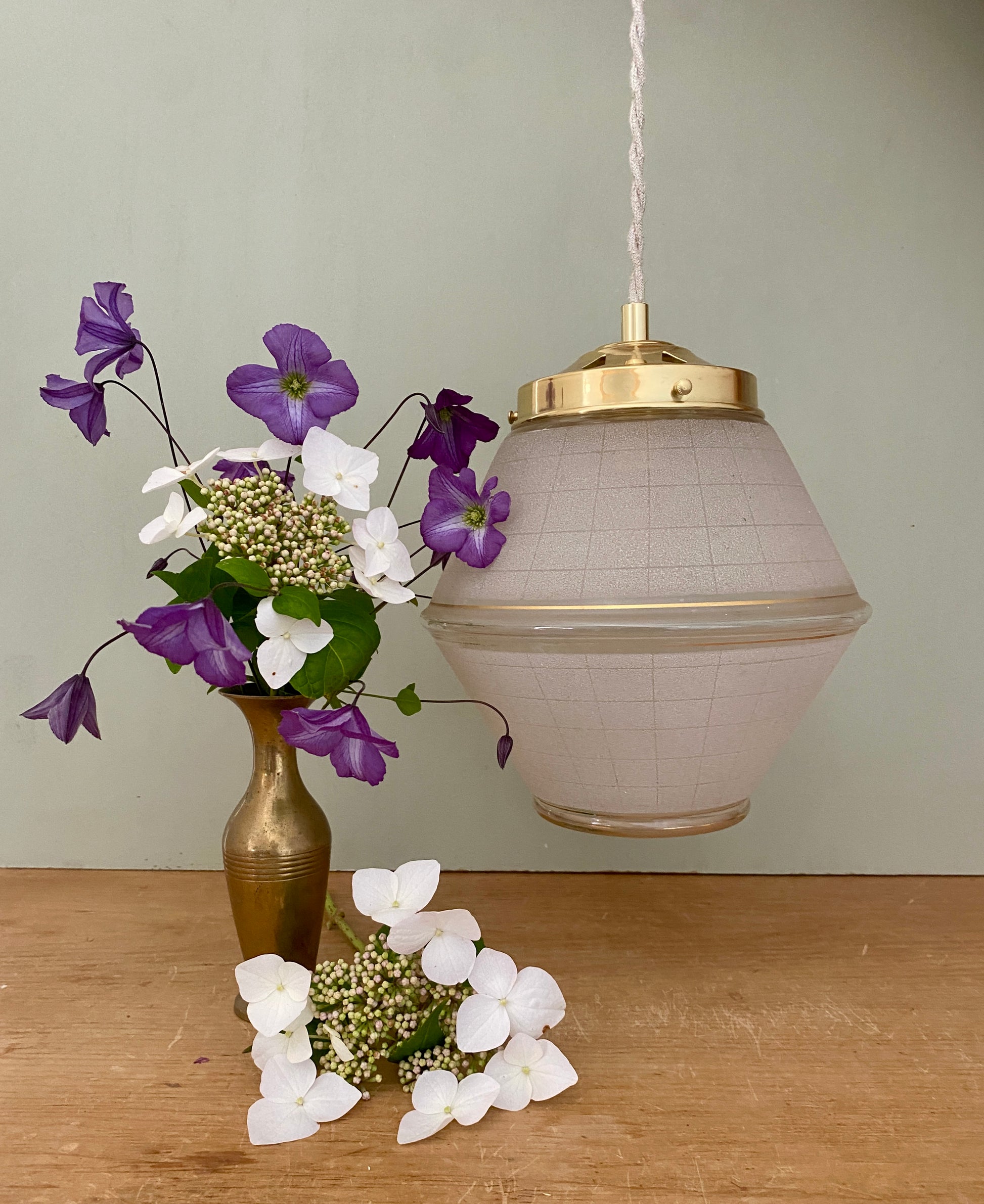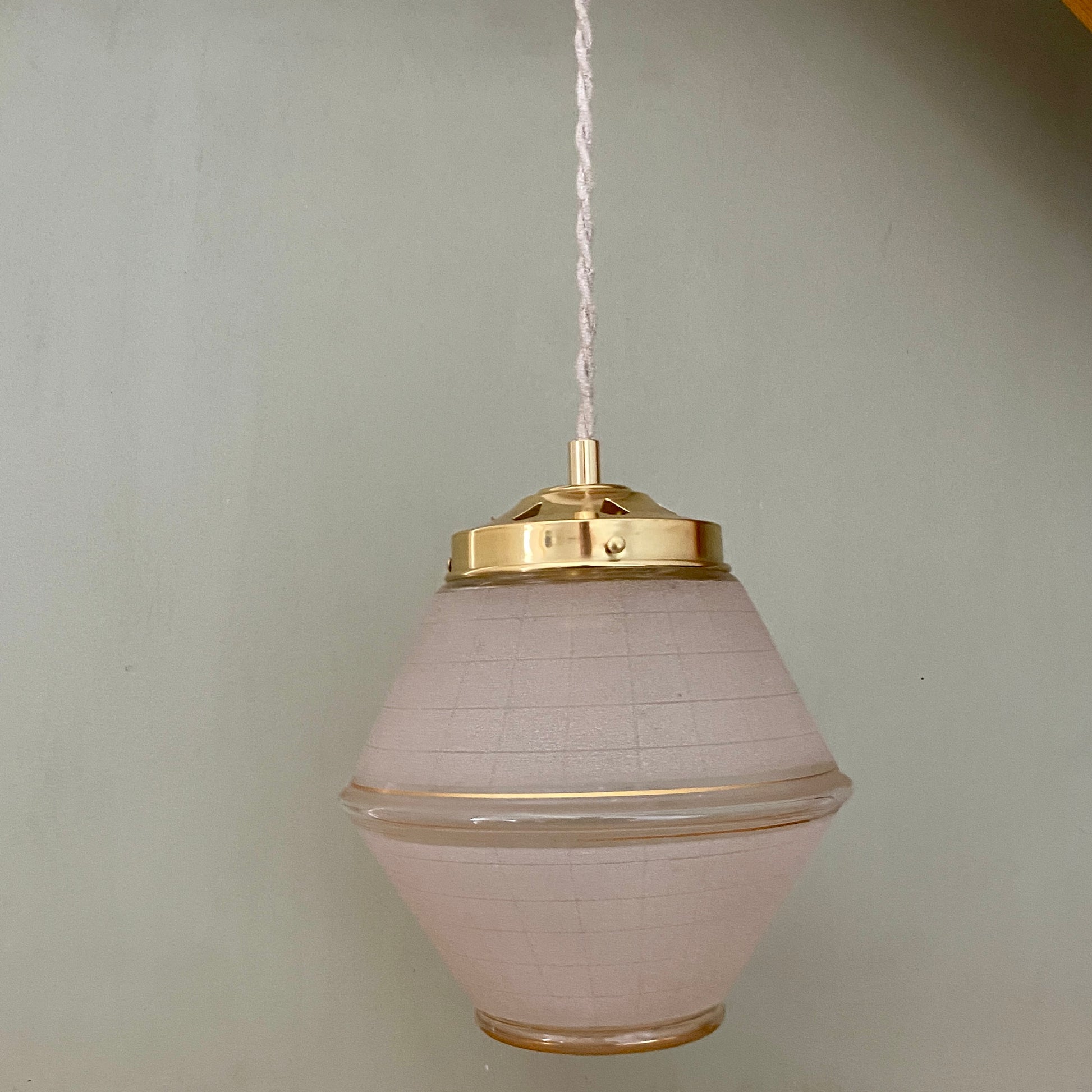 Belle suspension avec globe vintage art déco en verre givré blanc et doré.