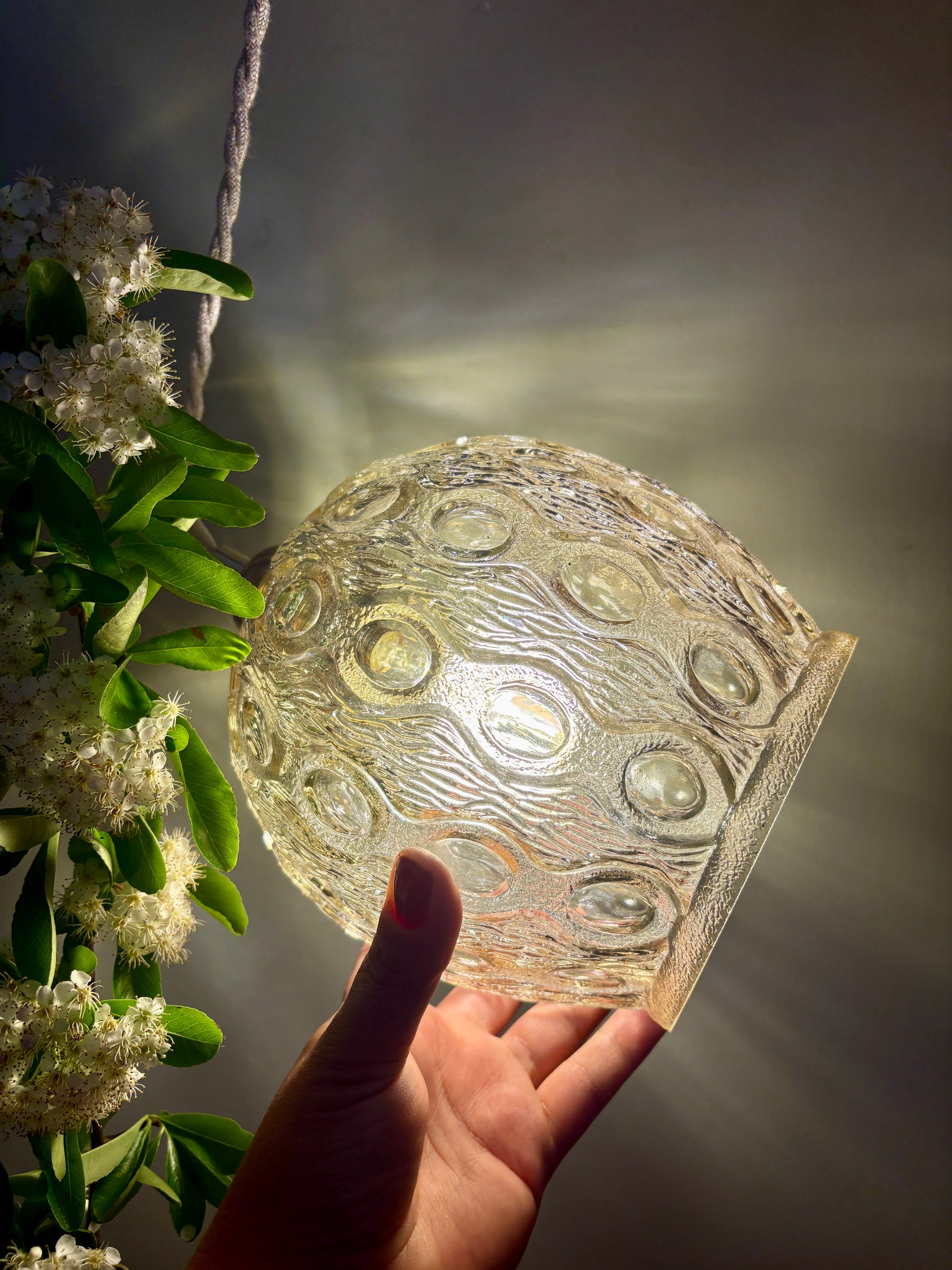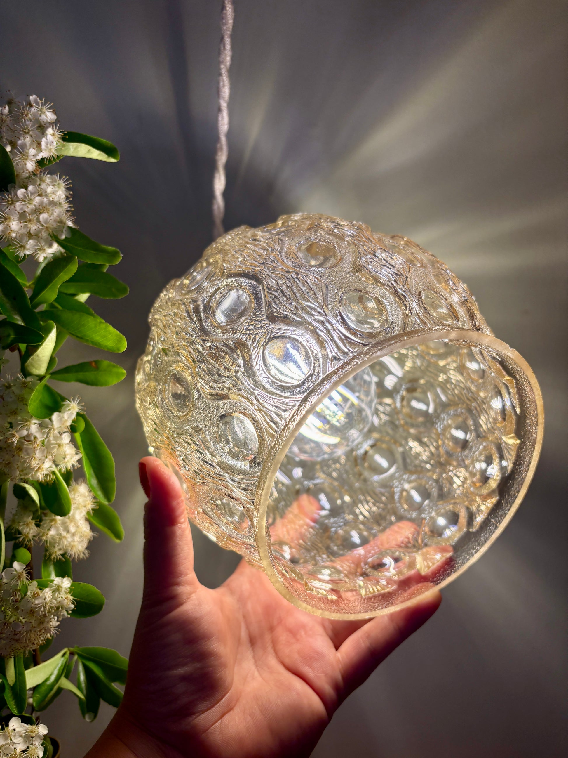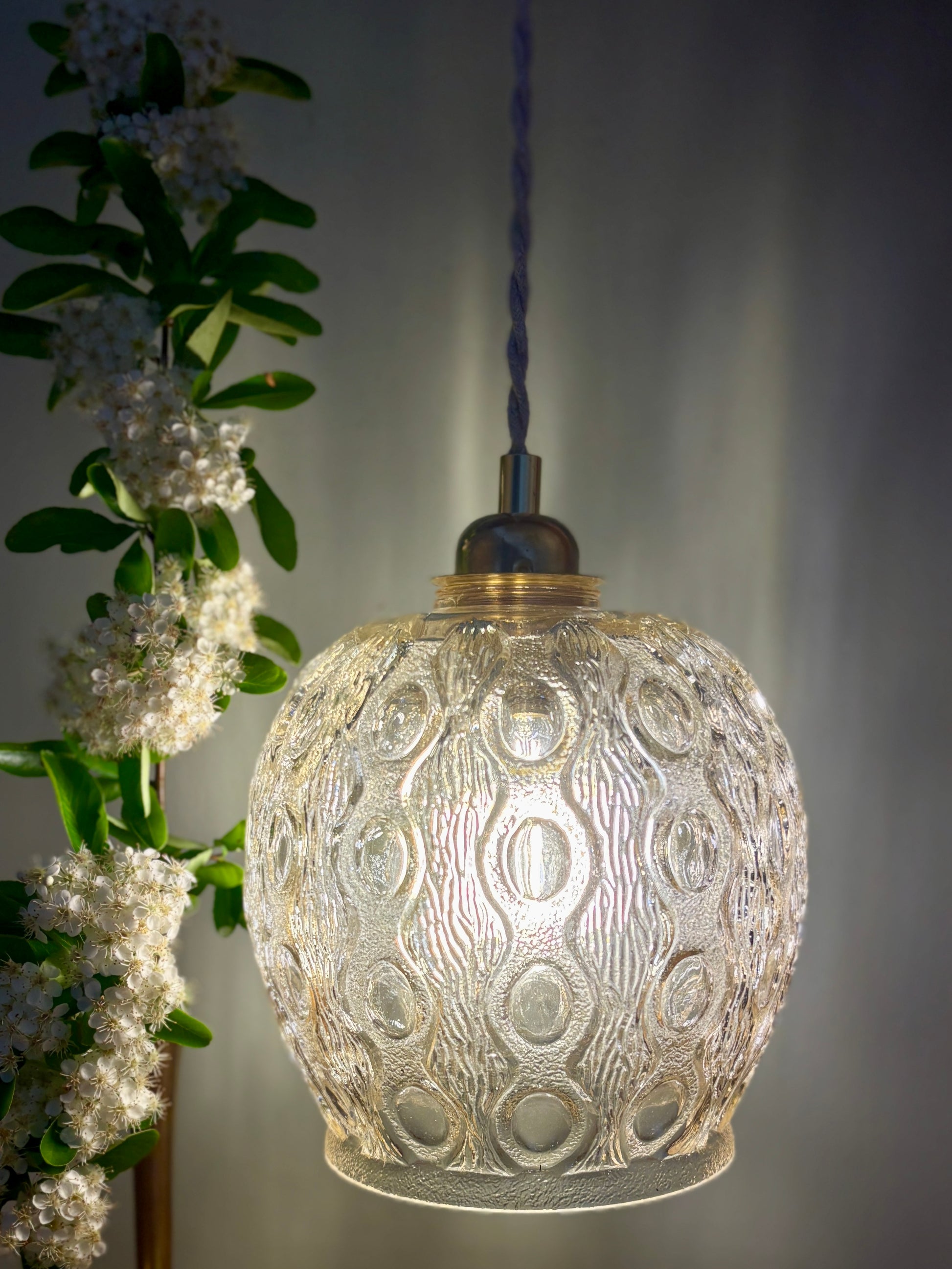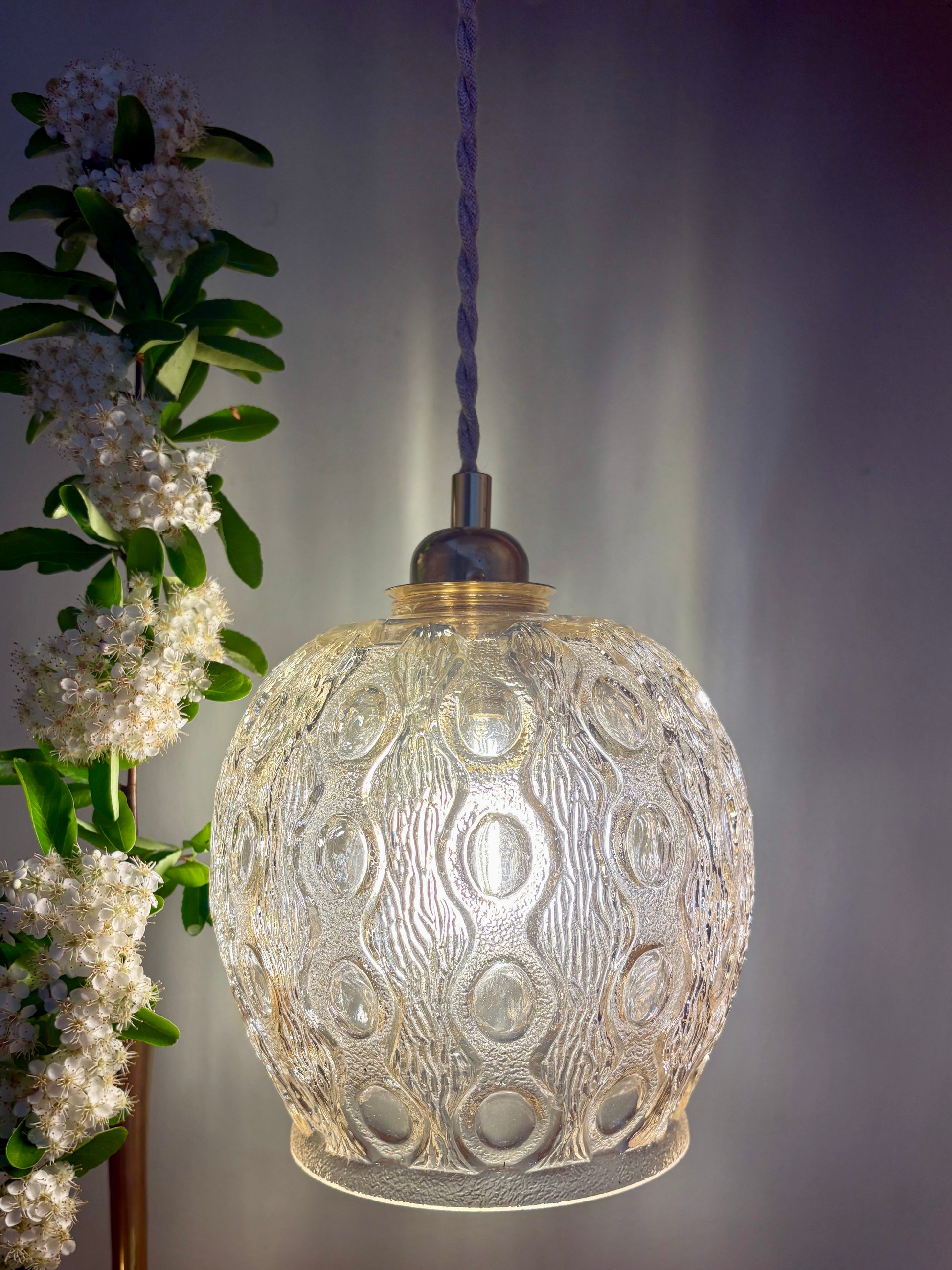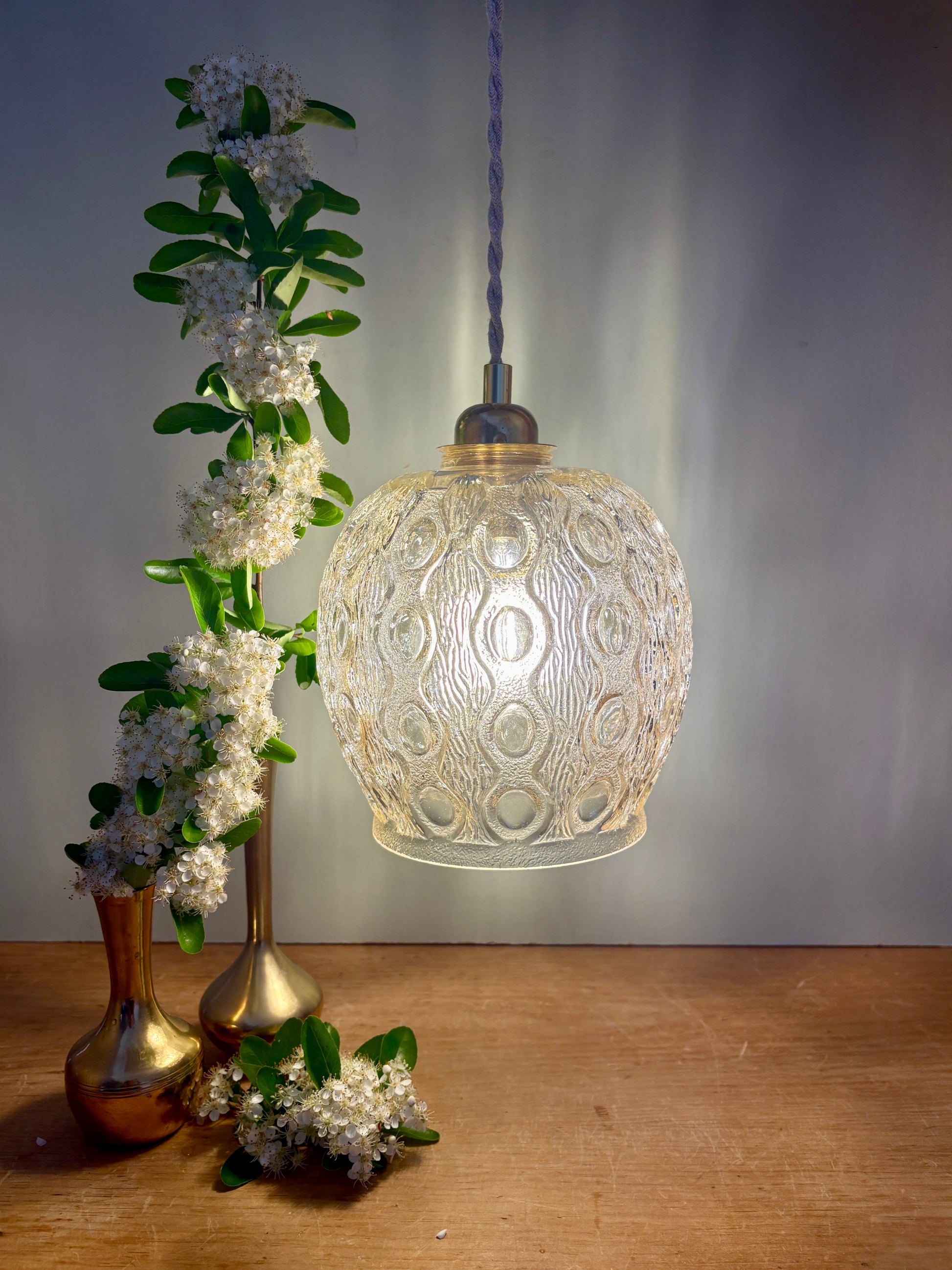 Jolie suspension avec globe vintage en verre moulé ambré.
