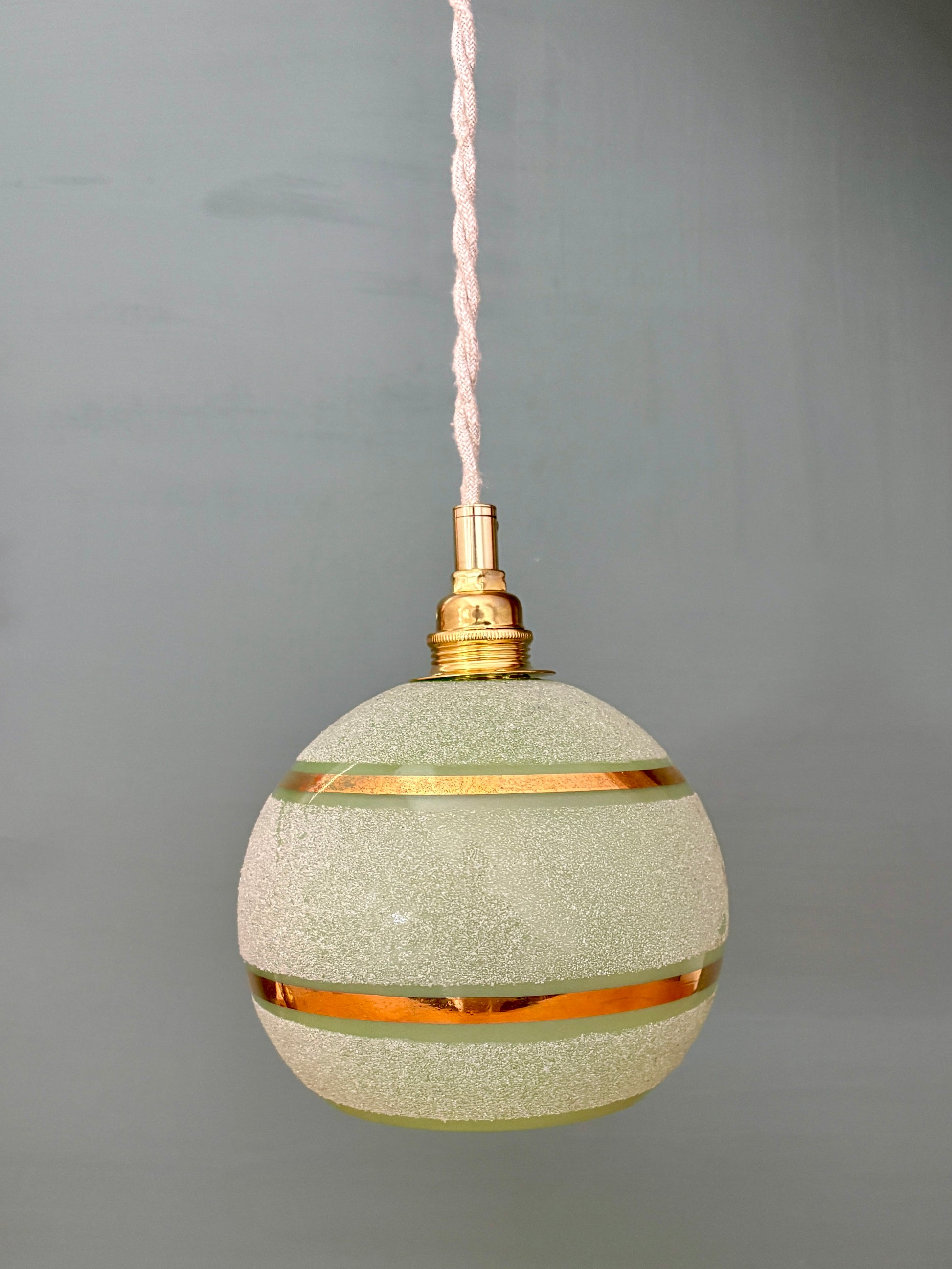 Belle suspension avec globe vintage art déco en verre granité jaune avec des liserés dorés.