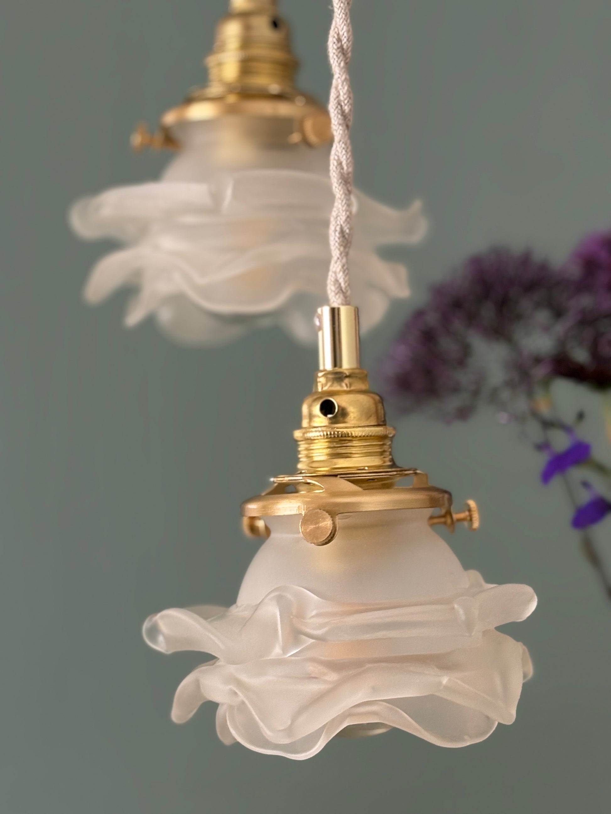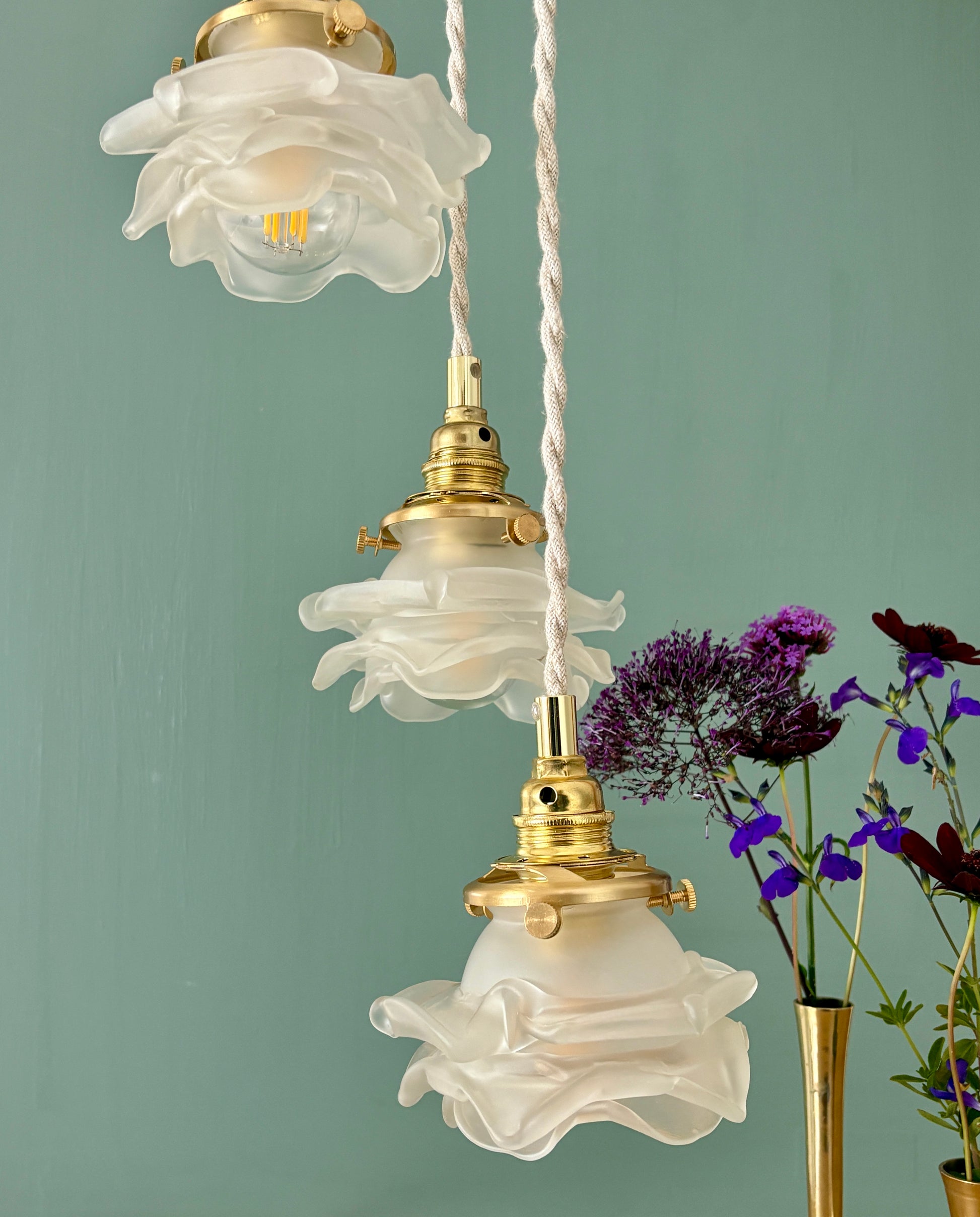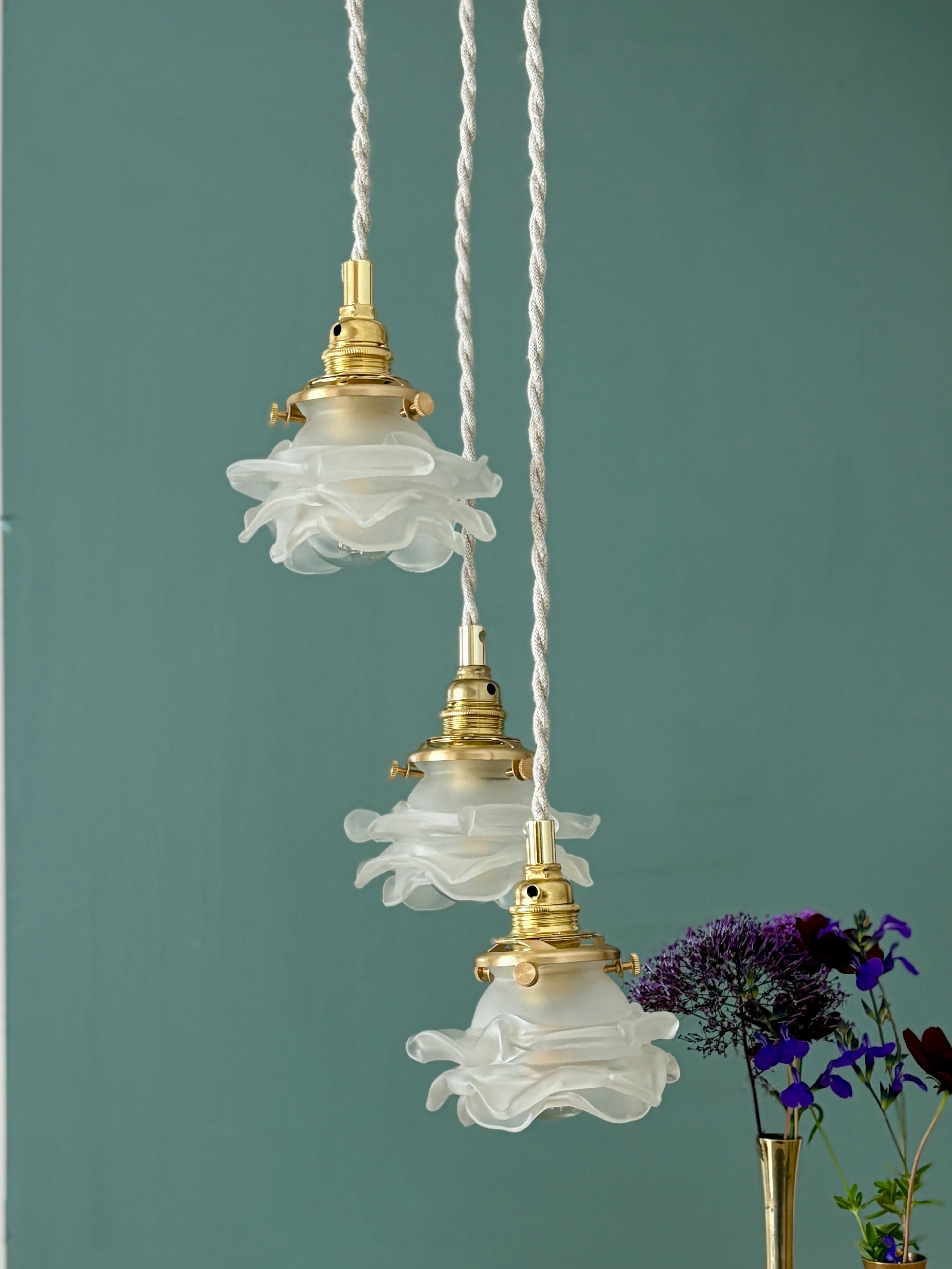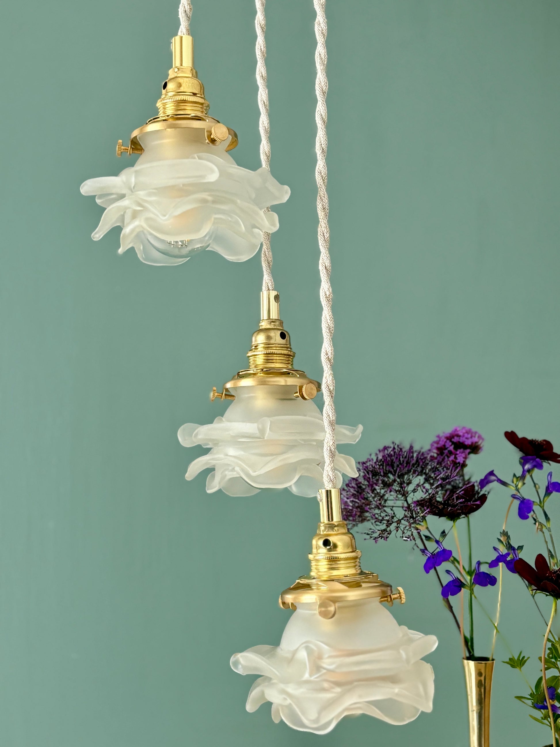 Suspension triple tulipes vintage en verre dépoli en forme de fleurs