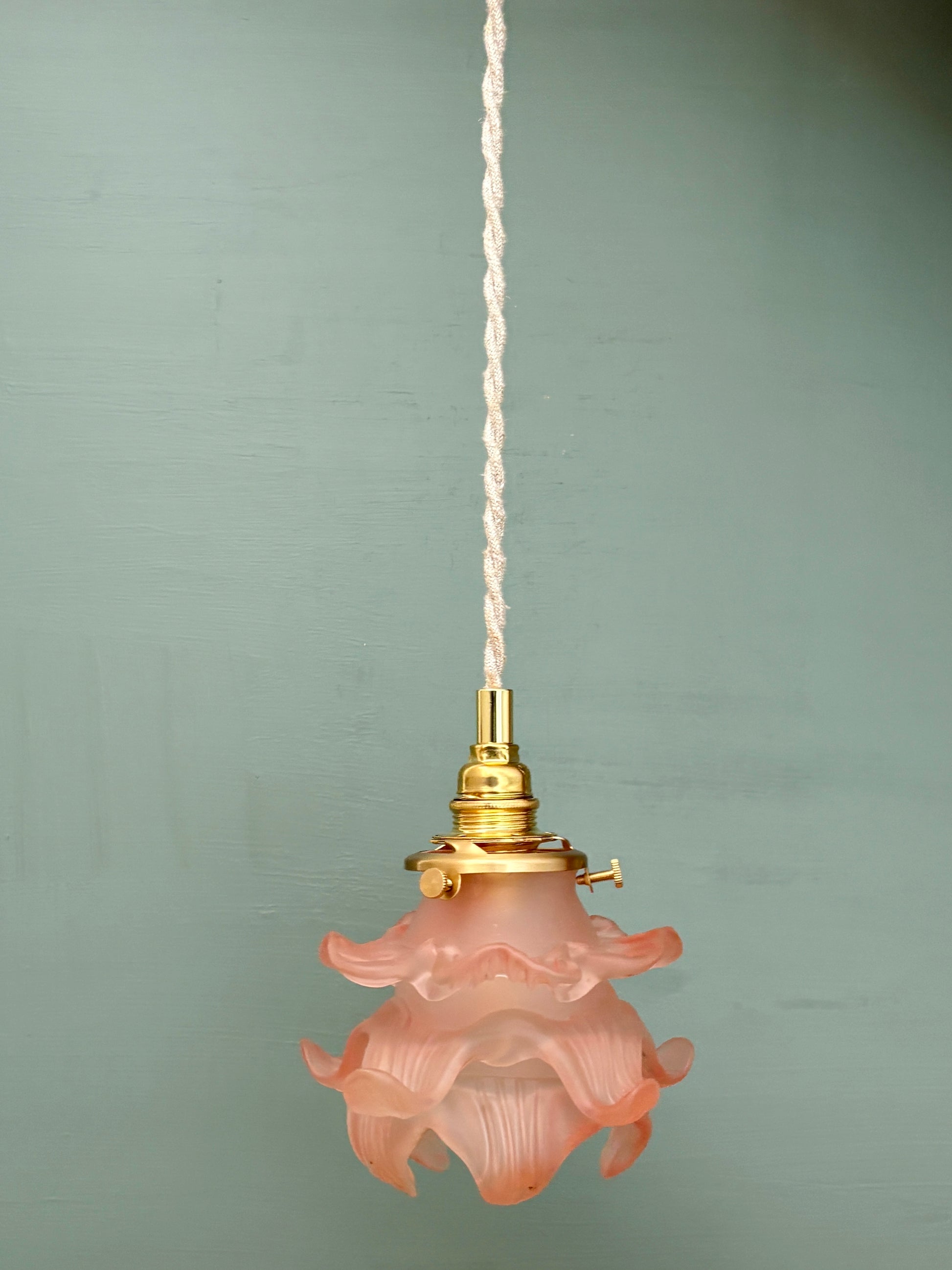Magnifique suspension tulipe vintage en verre dépoli rose.